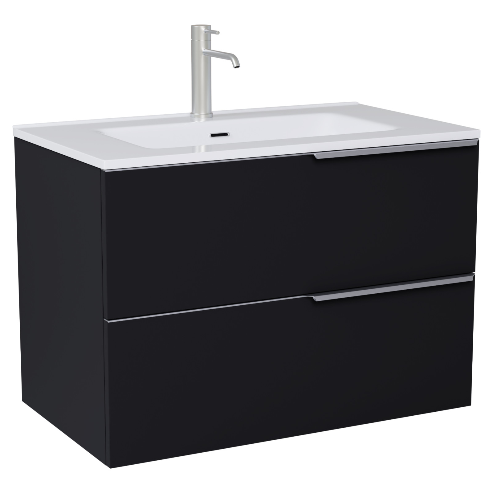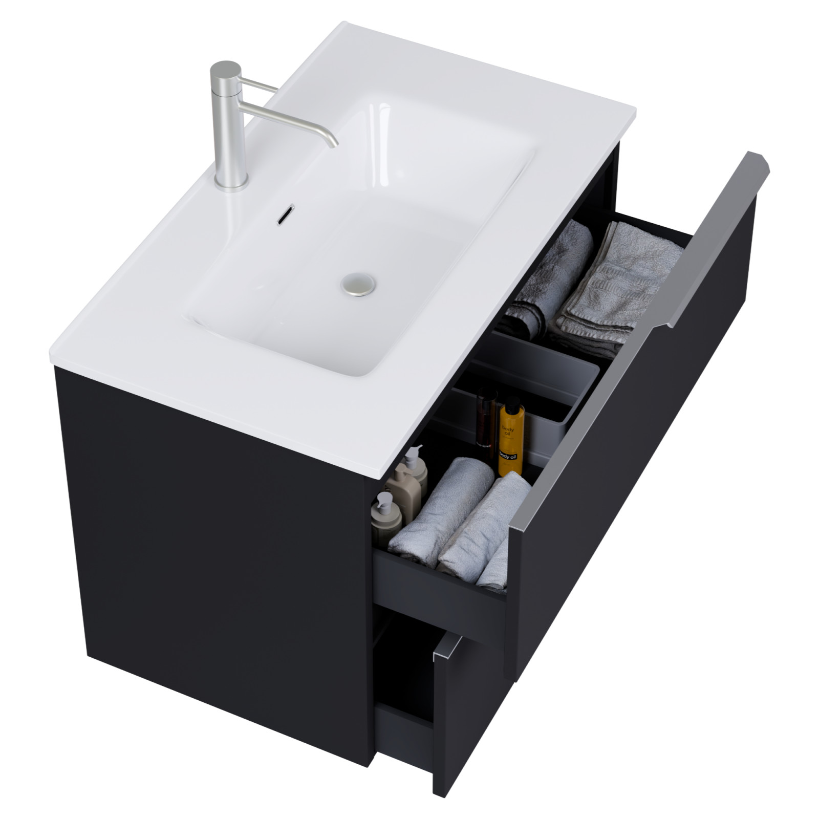 • matt fekete mosdószekrény, teljes kihúzhatóságú fiókokkal
