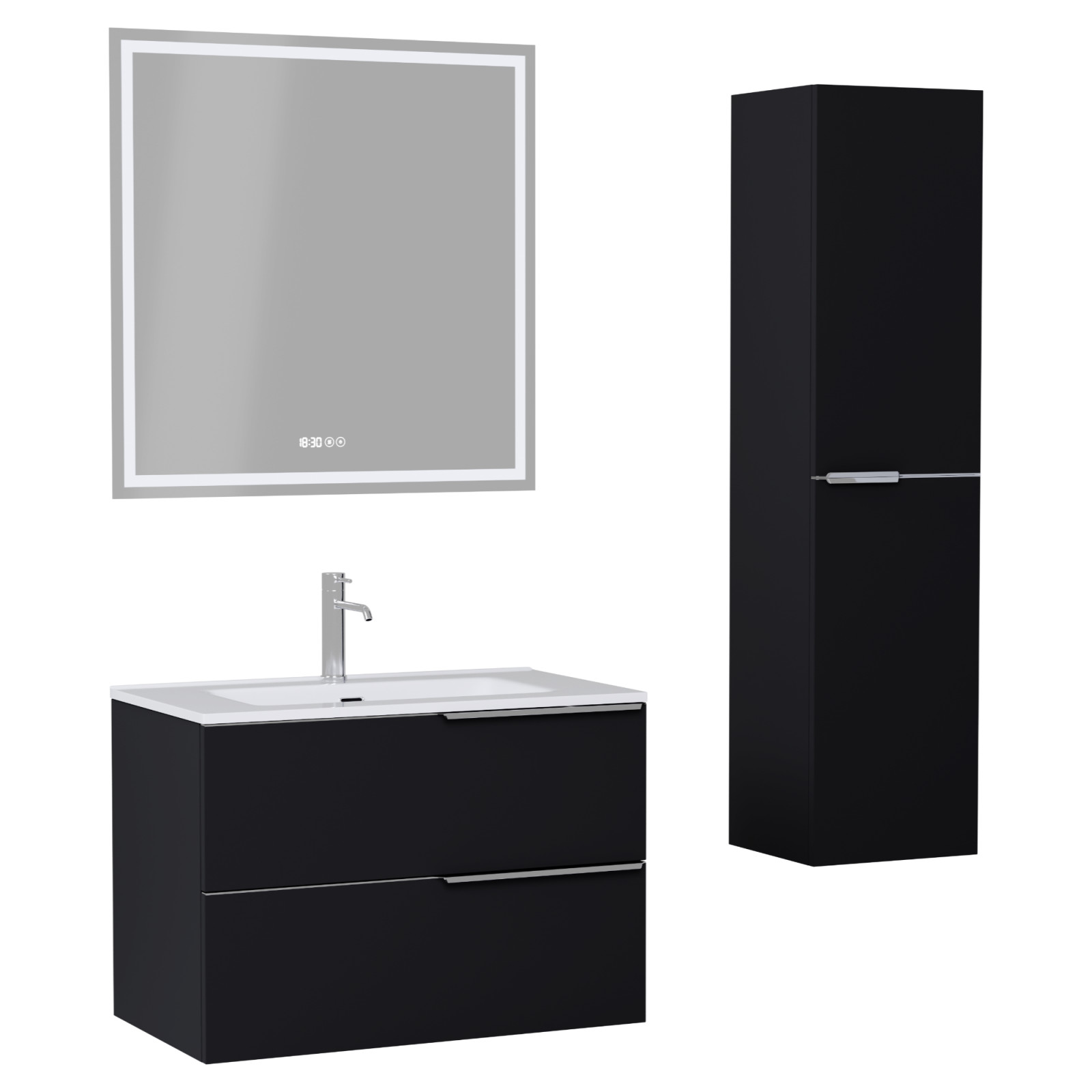 HD Cremona Matt Black 60 komplett fürdőszoba bútor szett fali mosdószekrénnyel, fényes króm fogantyúkkal, tükörrel és magasszekrénnyel