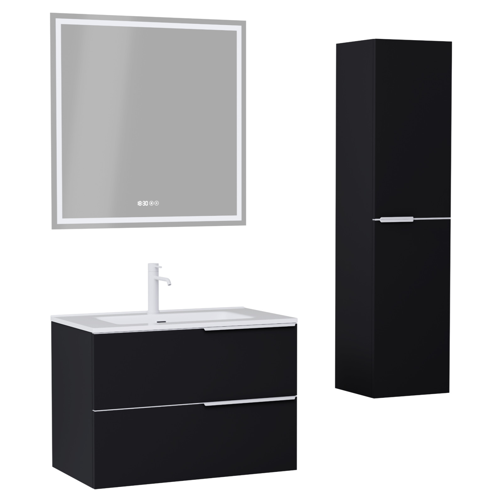 HD Cremona Matt Black 60 komplett fürdőszoba bútor szett fali mosdószekrénnyel, matt fehér fogantyúkkal, tükörrel és magasszekrénnyel