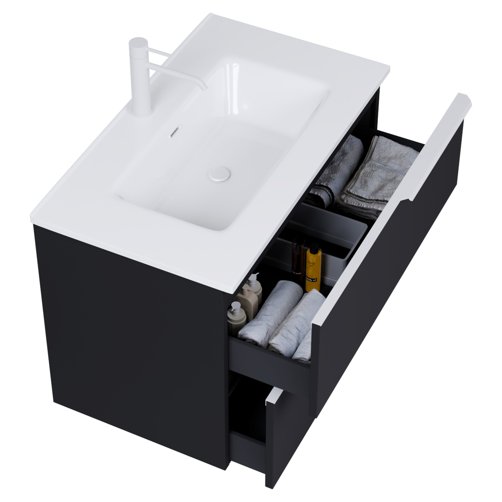 • matt fekete mosdószekrény, teljes kihúzhatóságú fiókokkal
