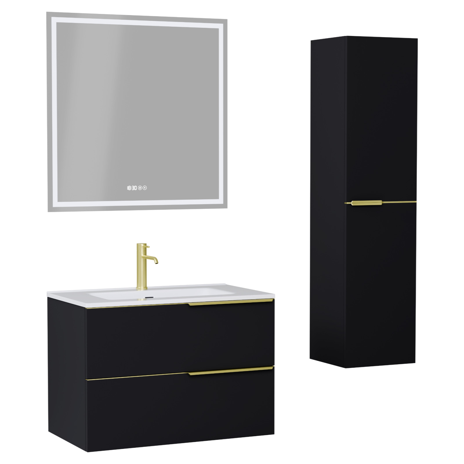 HD Cremona Matt Black 60 komplett fürdőszoba bútor szett fali mosdószekrénnyel, szálcsiszolt arany fogantyúkkal, tükörrel és magasszekrénnyel