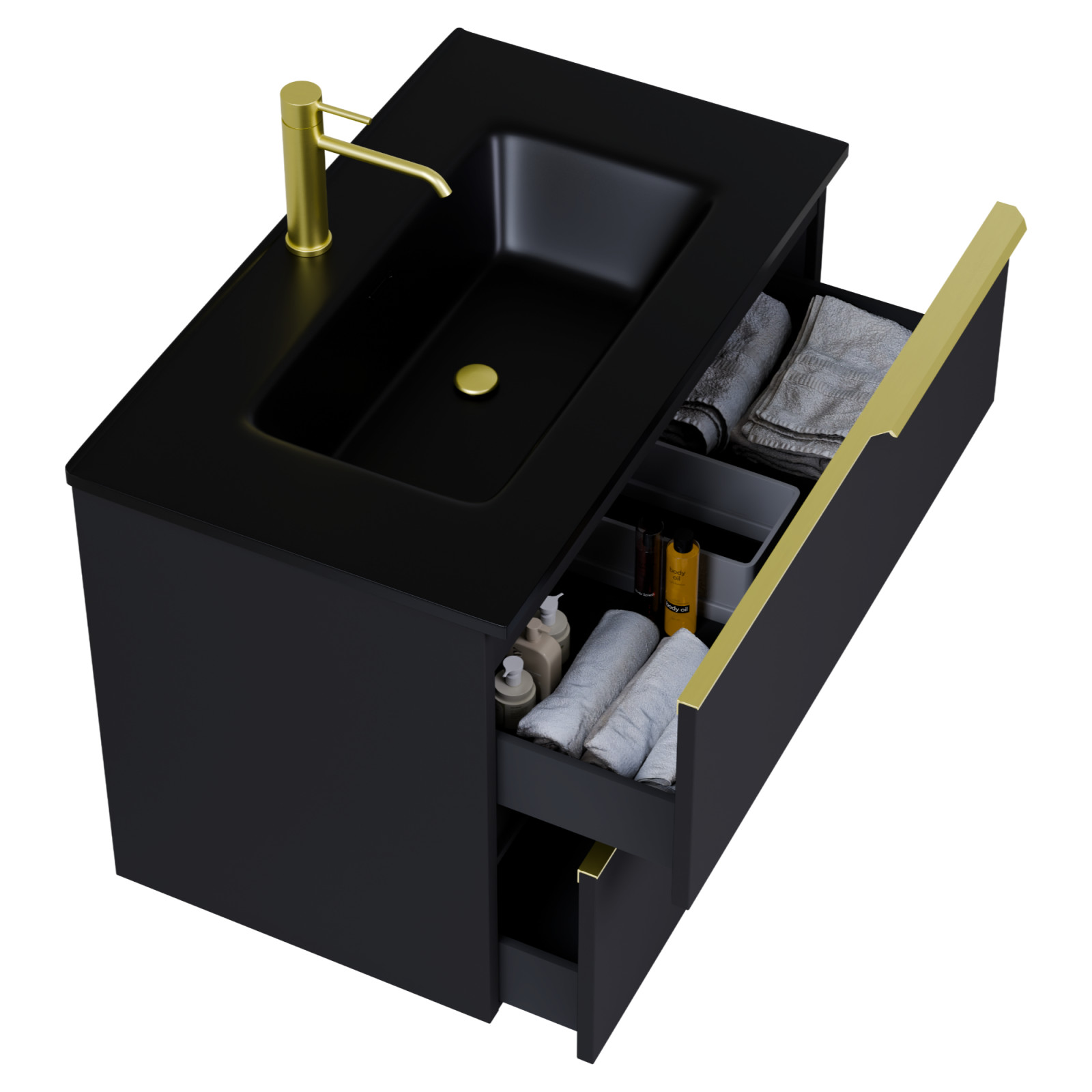 Saját márkás 80 cm széles fali mosdószekrény matt fekete színben, szálcsiszolt arany fogantyúkkal, fekete slim mosdóval, rejtett fióksínnel és önbehúzos technológiával ellátott.