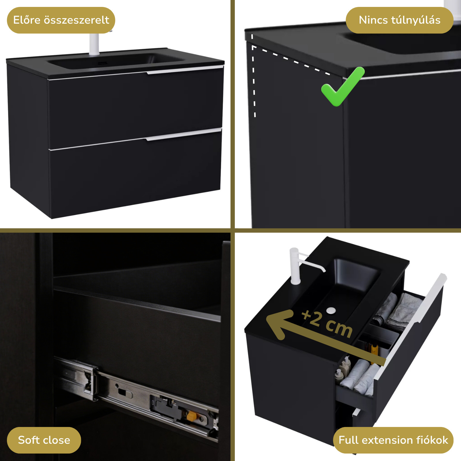 • matt fekete mosdószekrény, teljes kihúzhatóságú fiókokkal