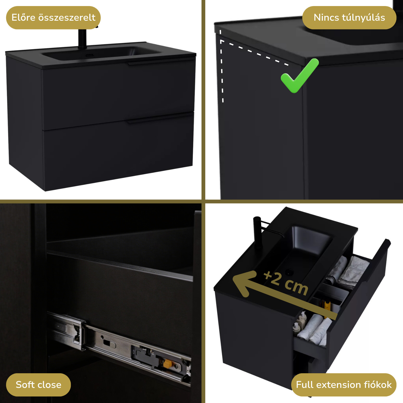 • matt fekete mosdószekrény, teljes kihúzhatóságú fiókokkal