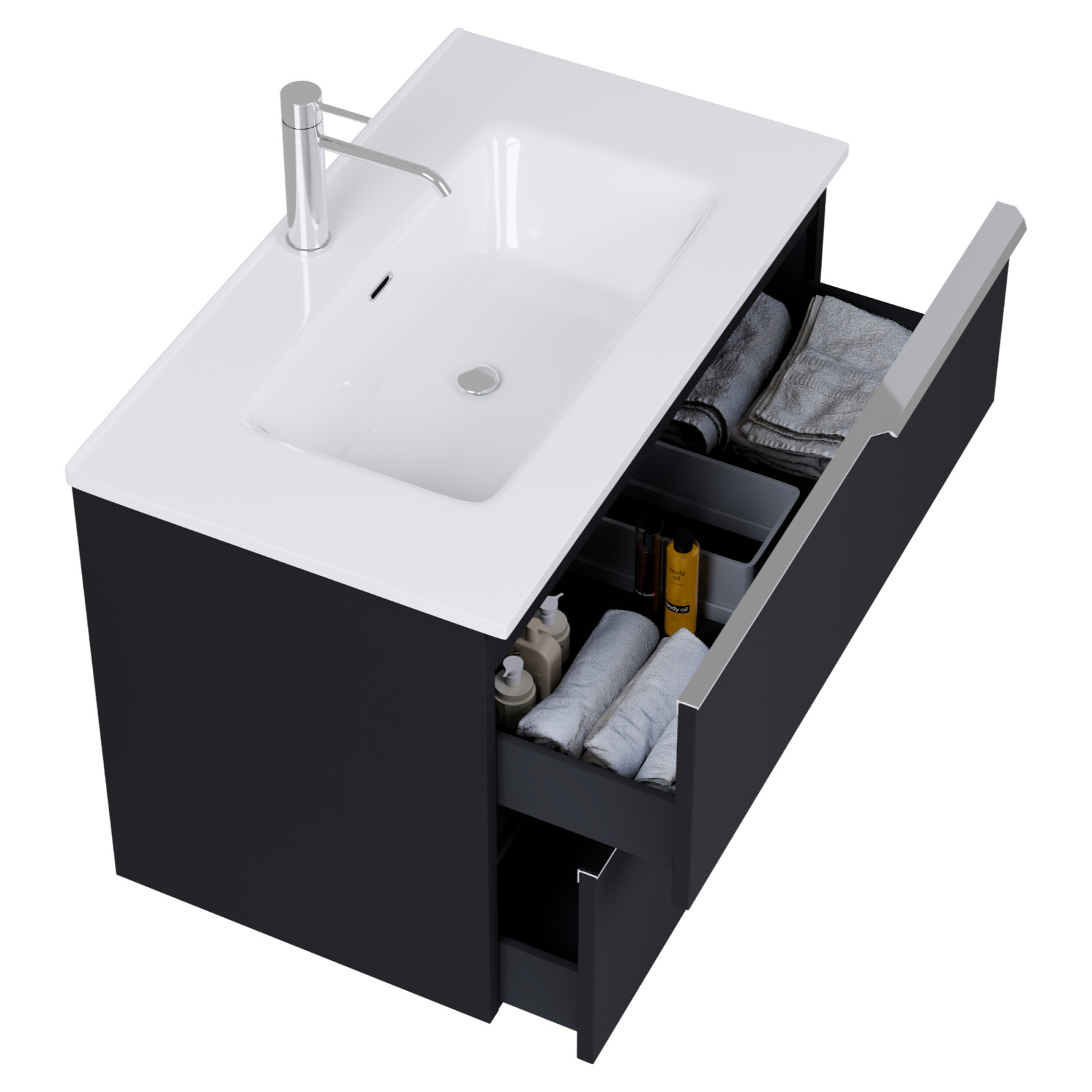 • matt fekete mosdószekrény, teljes kihúzhatóságú fiókokkal