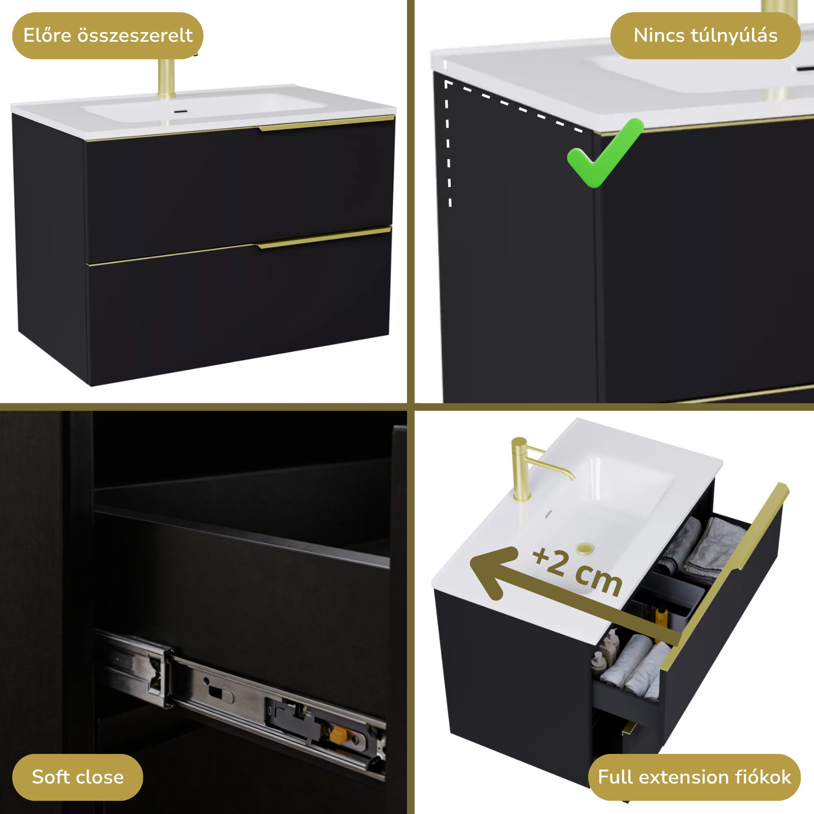 • matt fekete mosdószekrény, teljes kihúzhatóságú fiókokkal