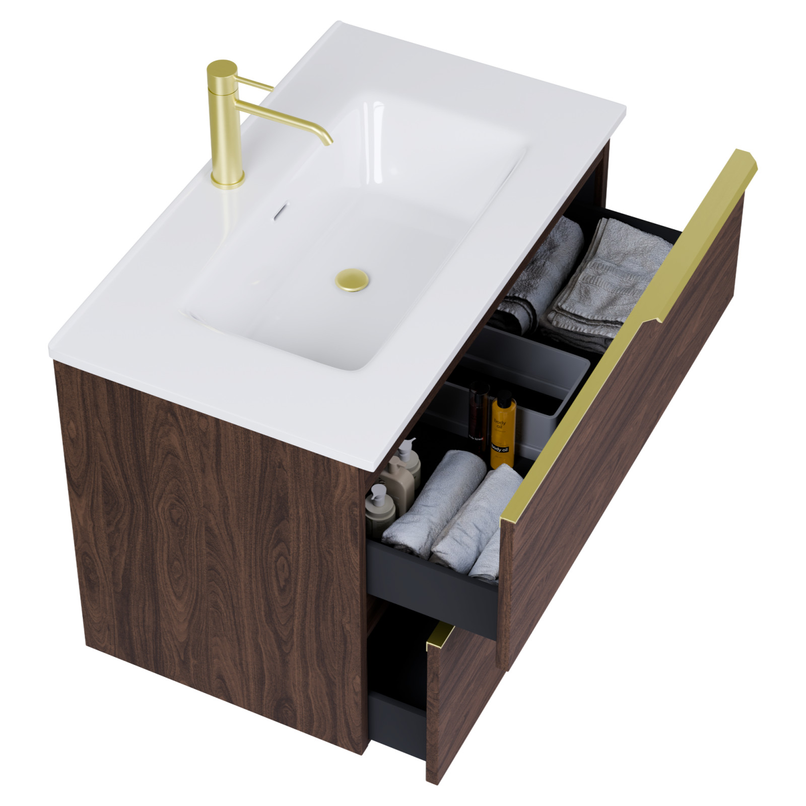 Saját márkás 60 cm széles fali mosdószekrény mogyoró színben, szálcsiszolt arany fogantyúkkal, rejtett fióksínnel és önbehúzos technológiával ellátott.