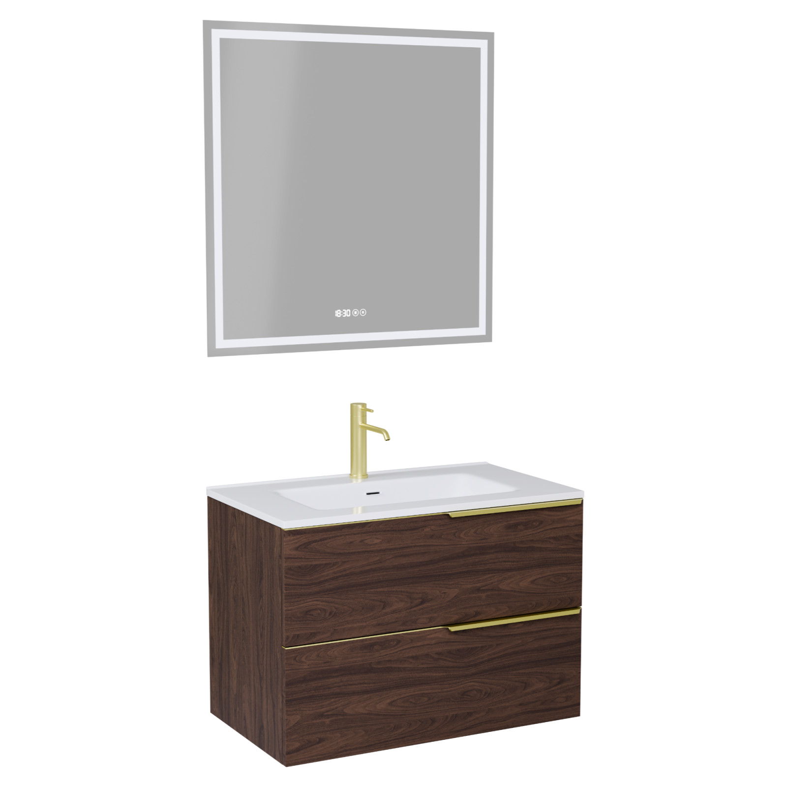 Saját márkás 60 cm széles komplett fürdőszoba bútor fali mosdószekrénnyel mogyoró színben, szálcsiszolt arany fogantyúkkal és fali okos LED tükörrel.