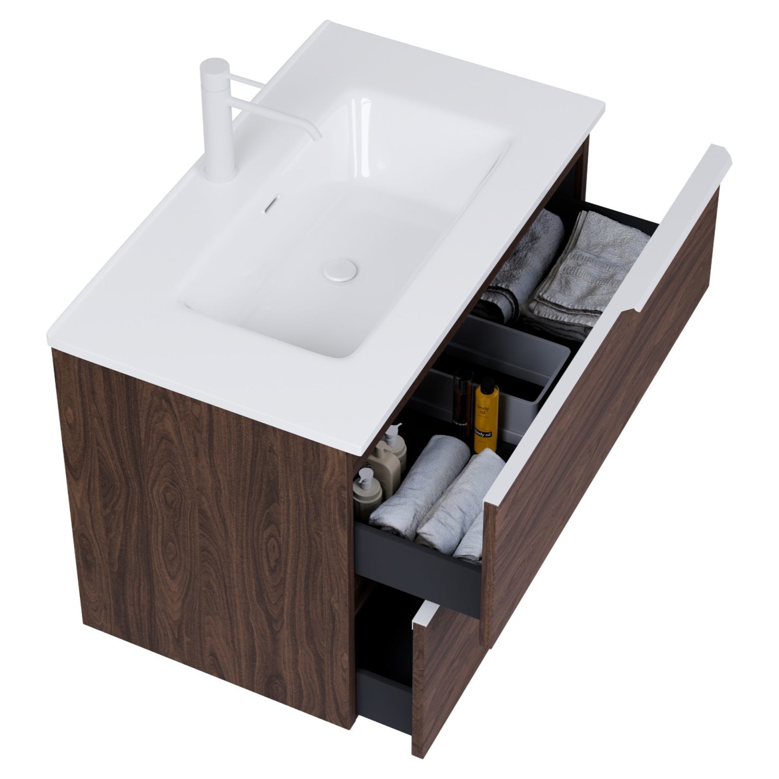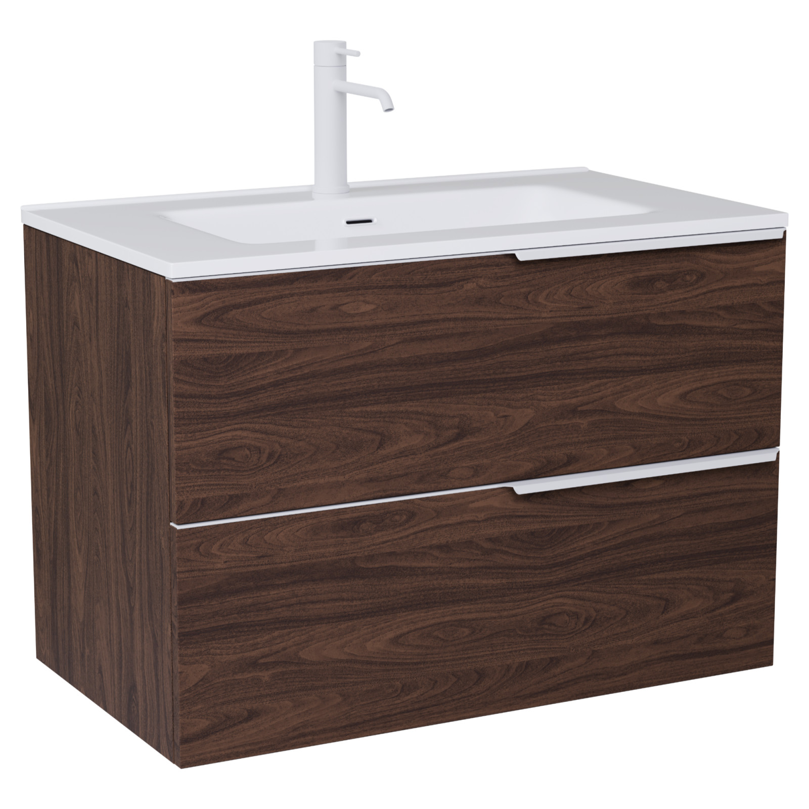 Saját márkás 80 cm széles fali mosdószekrény mogyoró színben, matt fehér fogantyúkkal, rejtett fióksínnel és önbehúzos technológiával ellátott.