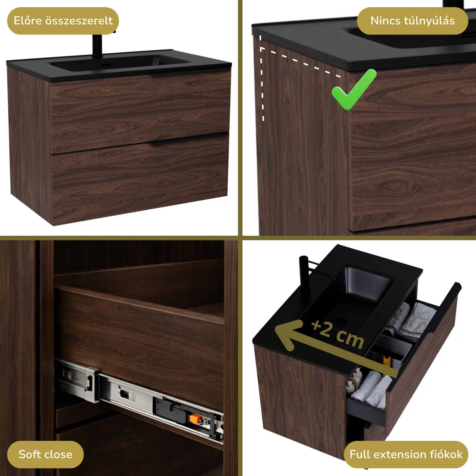Saját márkás 80 cm széles fali mosdószekrény mogyoró színben, matt fekete fogantyúkkal, fekete slim mosdóval, rejtett fióksínnel és önbehúzos technológiával ellátott.