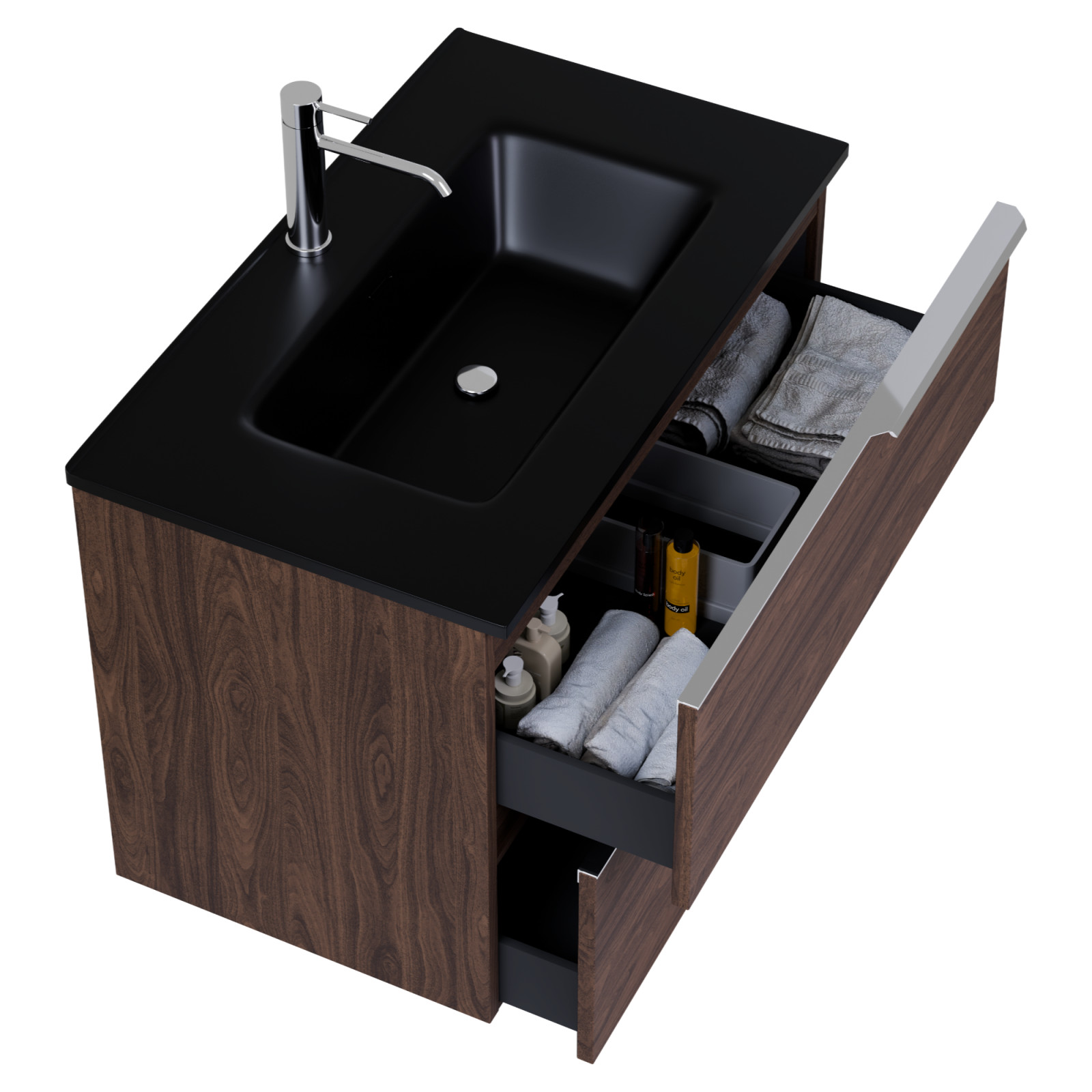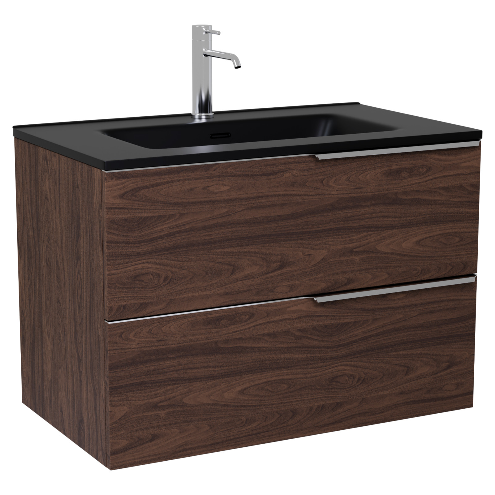 HD Cremona Matt Hazel 80 komplett fürdőszoba bútor szett fali mosdószekrénnyel, fényes króm fogantyúkkal, matt fekete slim mosdóval, tükörrel és magasszekrénnyel