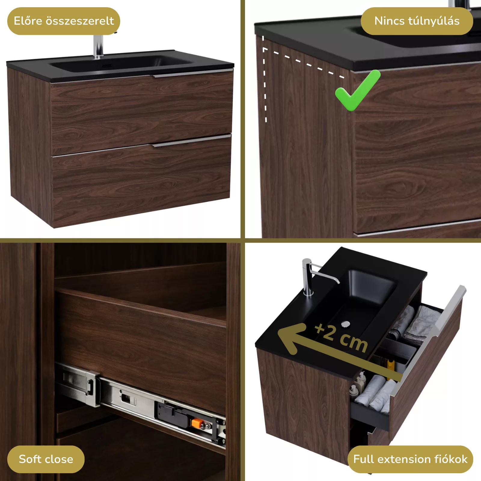 • mogyoró színű mosdószerkény, teljes kihúzhatóságú fiókokkal
