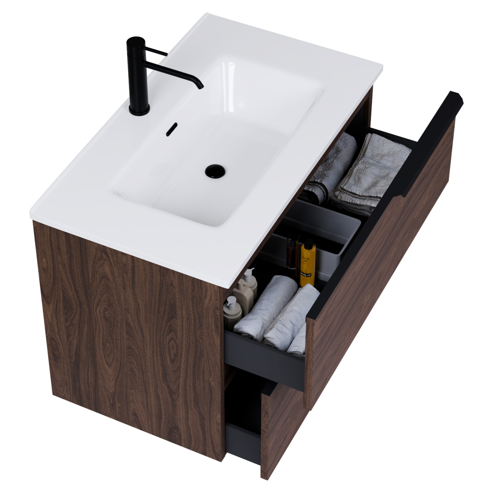 • mogyoró színű mosdószerkény, teljes kihúzhatóságú fiókokkal