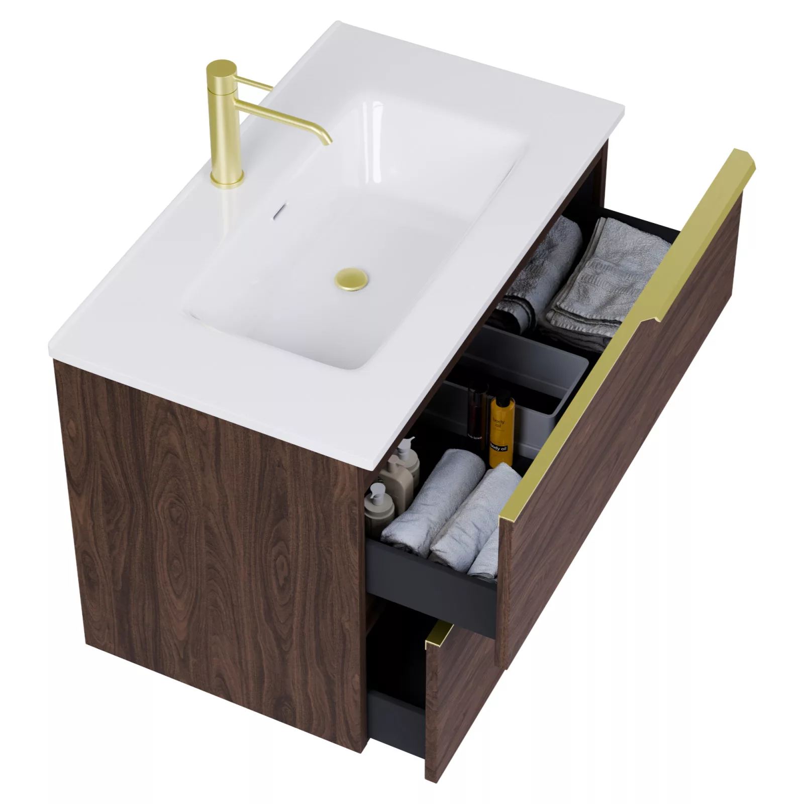 • mogyoró színű mosdószerkény, teljes kihúzhatóságú fiókokkal