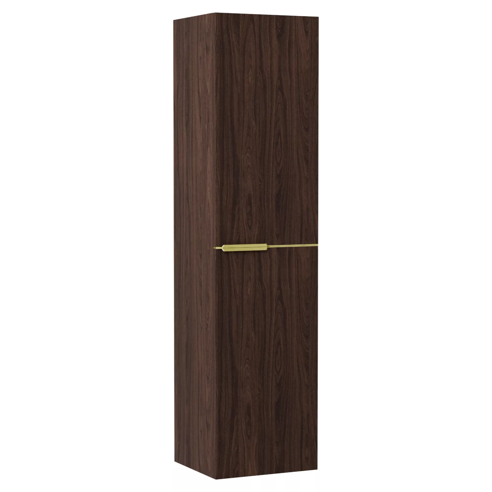 Saját márkás 80 cm széles komplett fürdőszoba bútor fali mosdószekrénnyel mogyoró színben, szálcsiszolt arany fogantyúkkal, okos LED tükörrel és magasszekrénnyel.