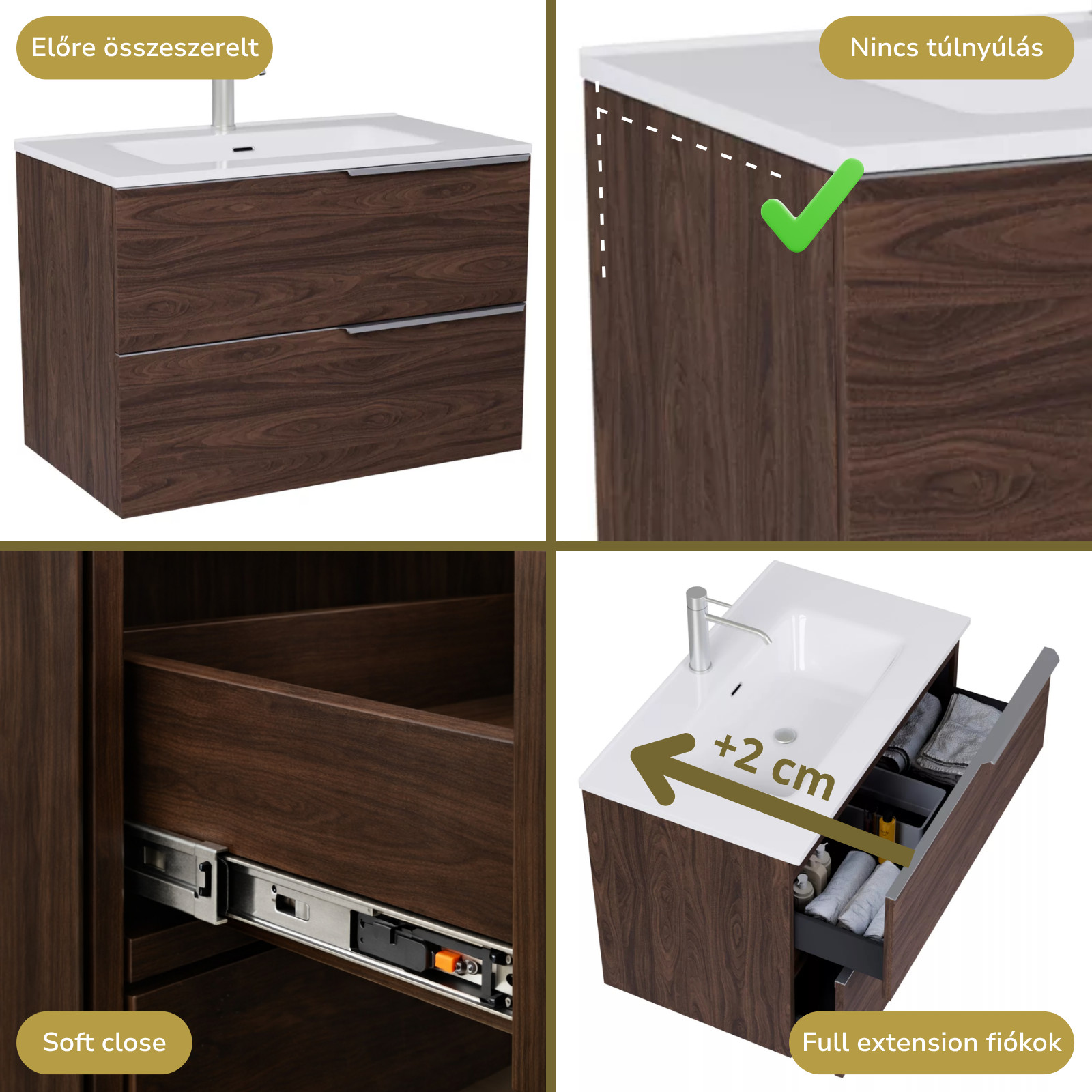 mogyoró színű mosdószerkény, teljes kihúzhatóságú fiókokkal