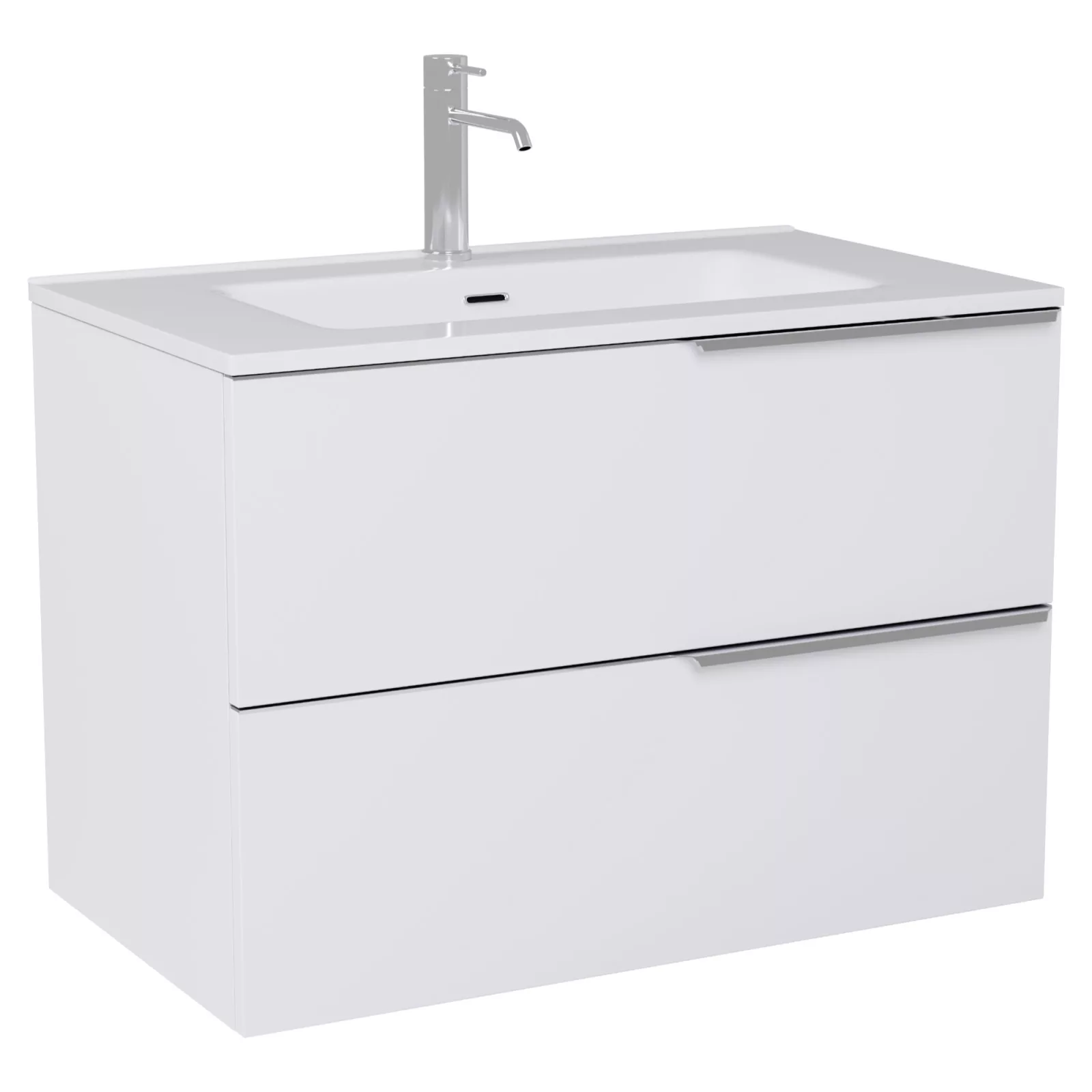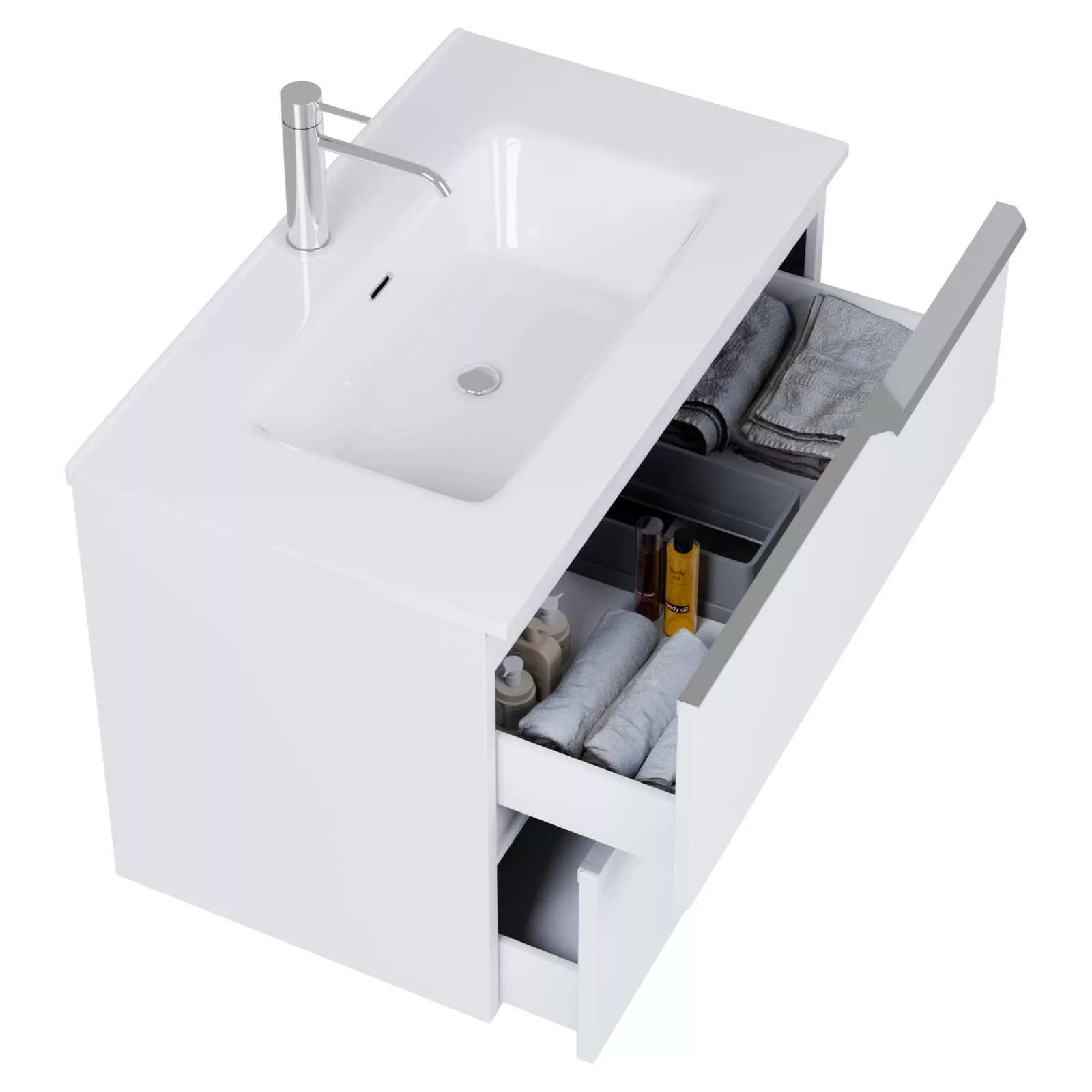 • matt fehér mosdószekrény, teljes kihúzhatóságú fiókokkal