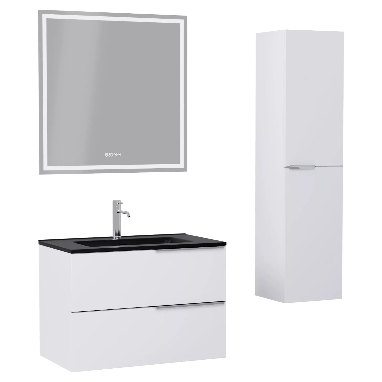 Saját márkás 60 cm széles komplett fürdőszoba bútor fali mosdószekrénnyel matt fehér színben, matt fekete fogantyúkkal, okos LED tükörrel és magasszekrénnyel.