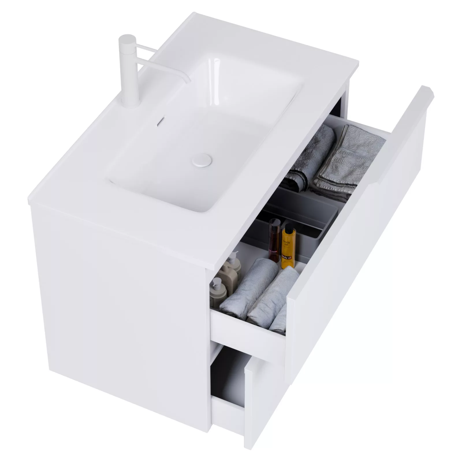 matt fehér mosdószekrény, teljes kihúzhatóságú fiókokkal