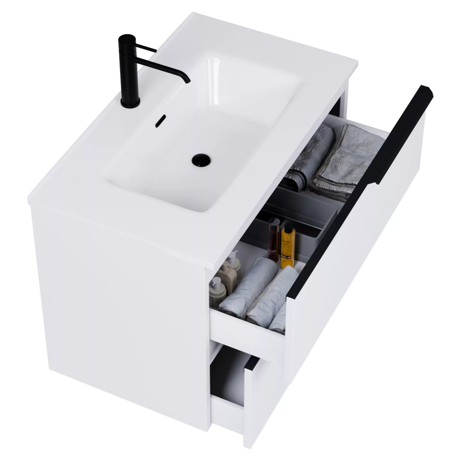 matt fehér mosdószekrény, teljes kihúzhatóságú fiókokkal