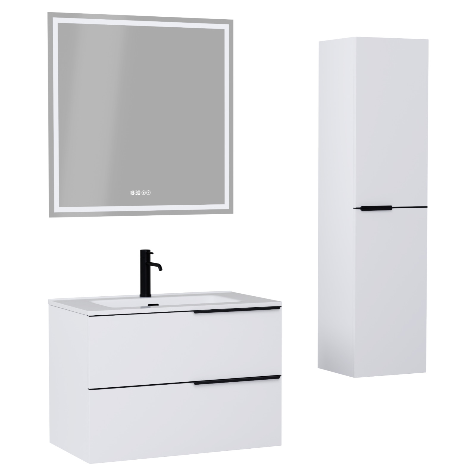 HD Cremona Matt White 60/80 komplett fürdőszoba bútor szett fali mosdószekrénnyel, matt fekete fogantyúkkal, tükörrel és magasszekrénnyel