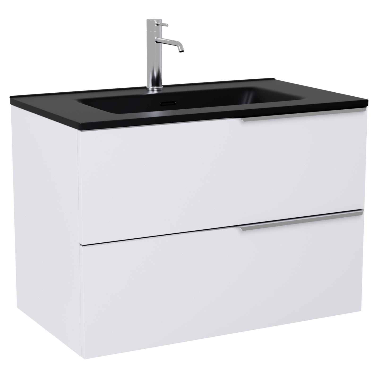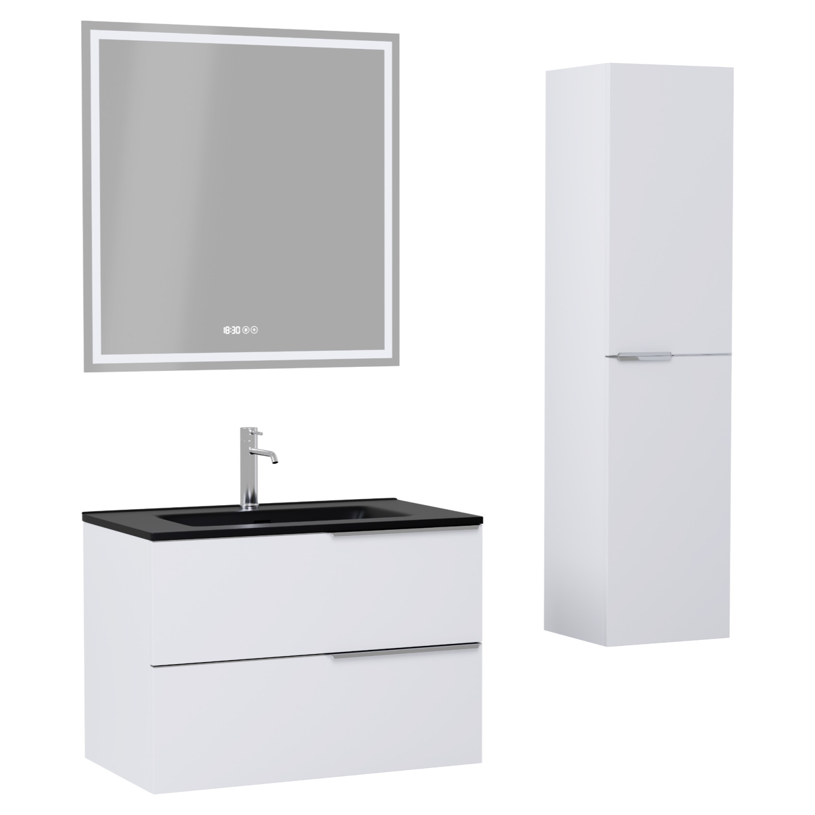 HD Cremona Matt White 80 komplett fürdőszoba bútor szett fali mosdószekrénnyel, fényes króm fogantyúkkal, matt fekete slim mosdóval, tükörrel és magasszekrénnyel