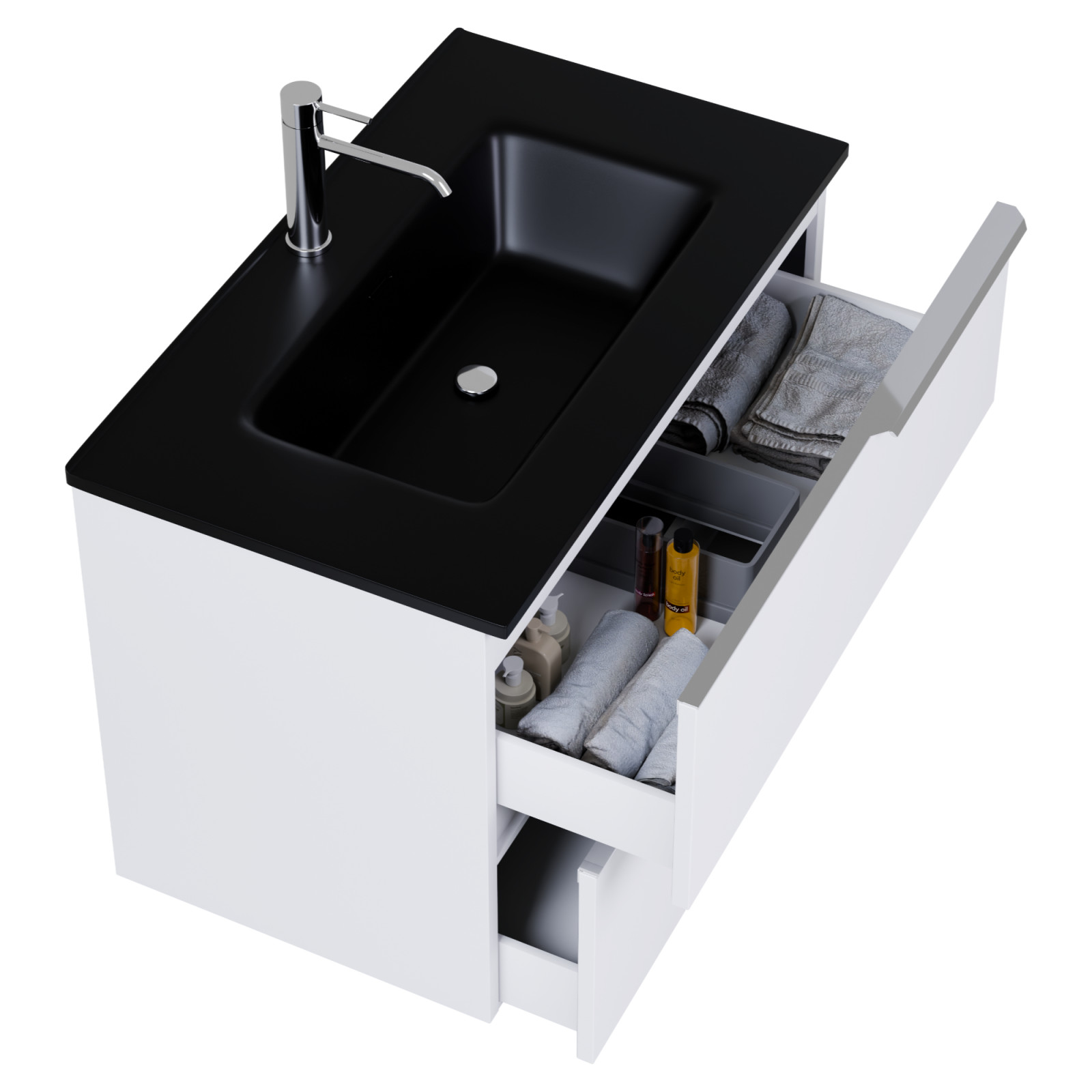 • matt fehér mosdószekrény, teljes kihúzhatóságú fiókokkal