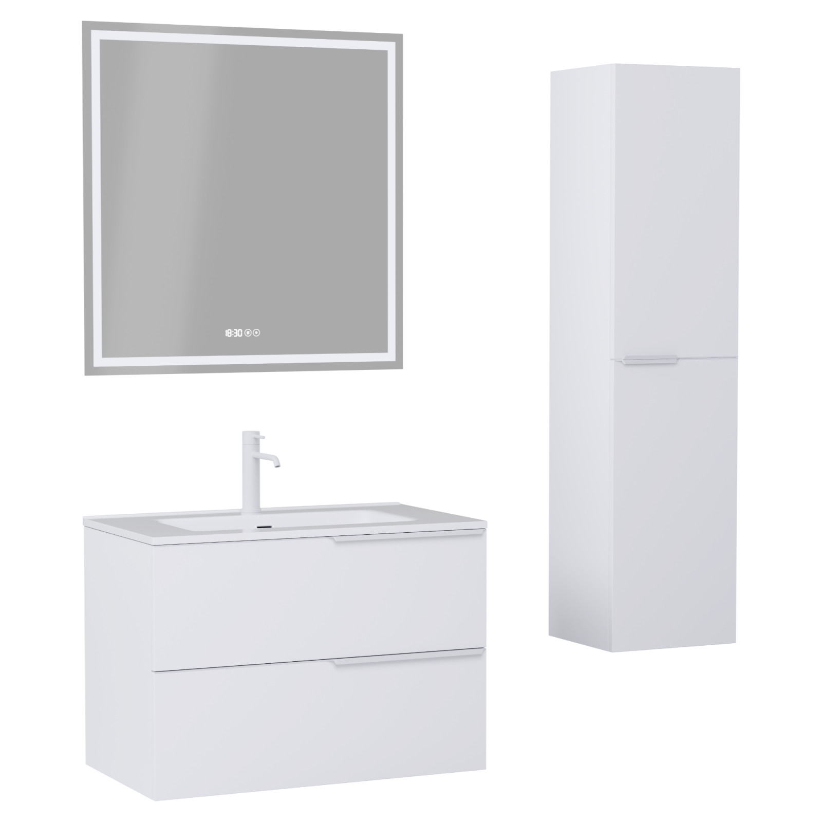 Saját márkás 80 cm széles komplett fürdőszoba bútor fali mosdószekrénnyel matt fehér színben, matt fehér fogantyúkkal, okos LED tükörrel és magasszekrénnyel.