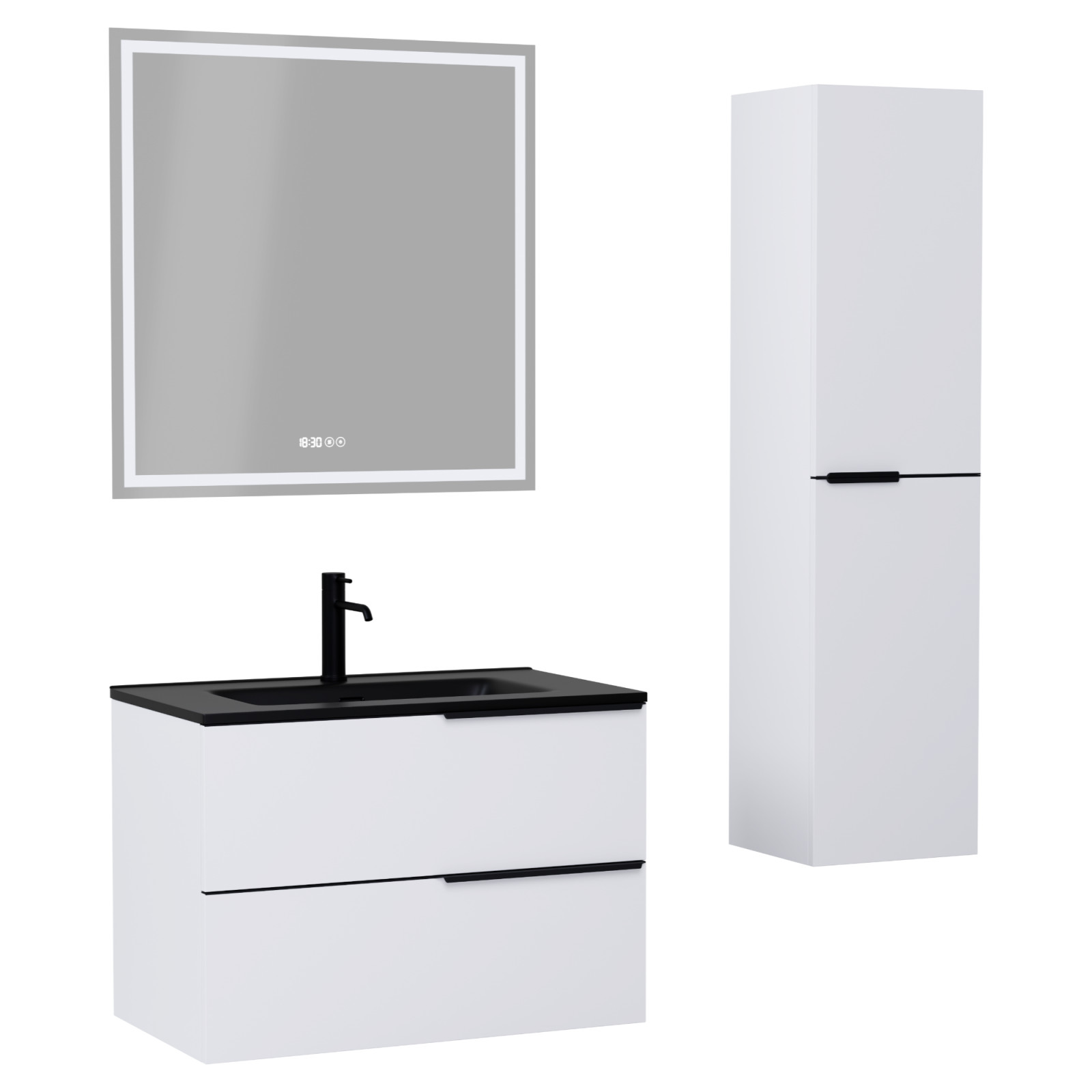 HD Cremona Matt White 80 komplett fürdőszoba bútor szett fali mosdószekrénnyel, matt fekete fogantyúkkal, matt fekete slim mosdóval, tükörrel és magasszekrénnyel