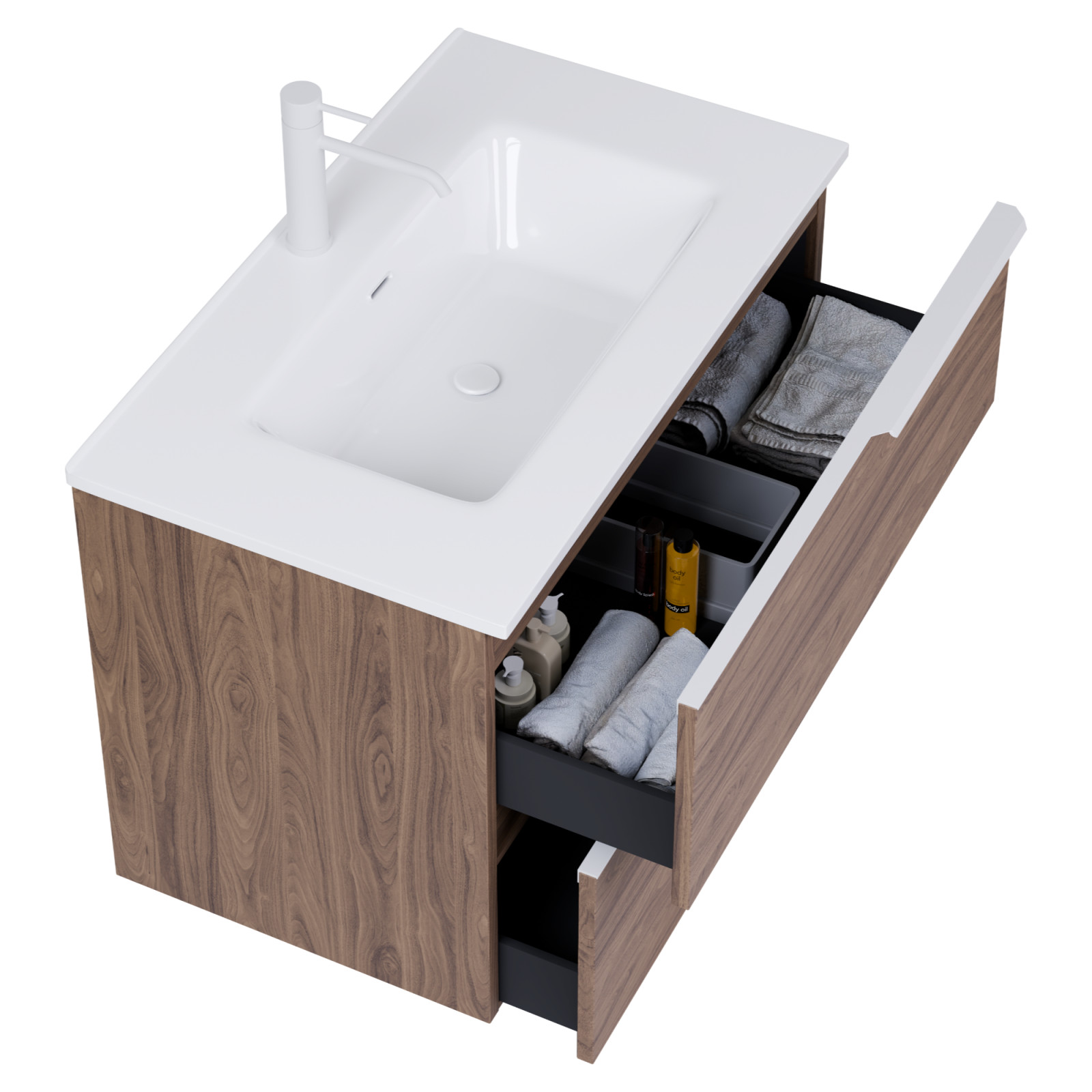 Napjainkban a praktikum mellett a fürdőszoba esztétikus megjelenése is fontos szempont. A függesztett bútorok egyre elterjedtebbé válnak, mivel számos előnnyel rendelkeznek, ide sorolható a modern, könnyed megjelenés és az egyszerű tisztítás. A függesztett fürdőszobai bútorok a klasszikus és modernebb stílusú fürdőszobákban is megállják a helyüket egyaránt. Nagyfokú rugalmasság jellemzi őket, mivel szinte bárhol elhelyezhetők a fürdőszobán belül. További előnyük, hogy soft close (csillapítós) zsanérral felszereltek, így  becsukáskor az ajtó vagy fiók finoman záródik be, csökkentve a terhelést és növelve az élettartamot. A szekrény fehér és matt fekete mosdóval, illetve mosdópulttal is szabadon kombinálható ízlés szerint. A teljesség érdekében a mosdószekrényekhez illő LED okostükröt és magas szekrényt is választhatunk, hogy a fürdőszobában lévő bútorok egy szemet gyönyörködtető egységet alkossanak.