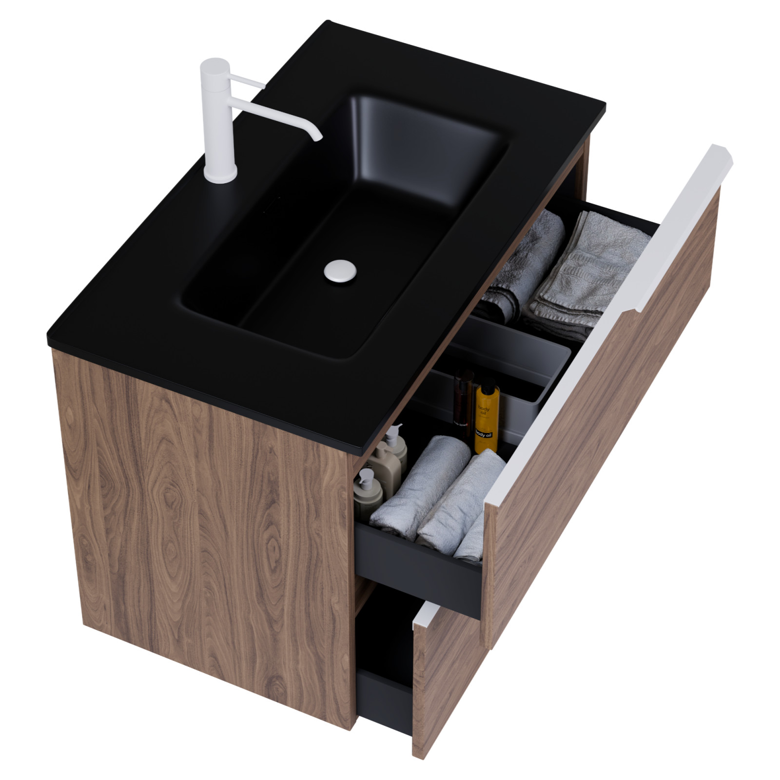 Saját márkás 80 cm széles fali mosdószekrény tölgyfa színben, matt fehér fogantyúkkal, fekete slim mosdóval, rejtett fióksínnel és önbehúzos technológiával ellátott.