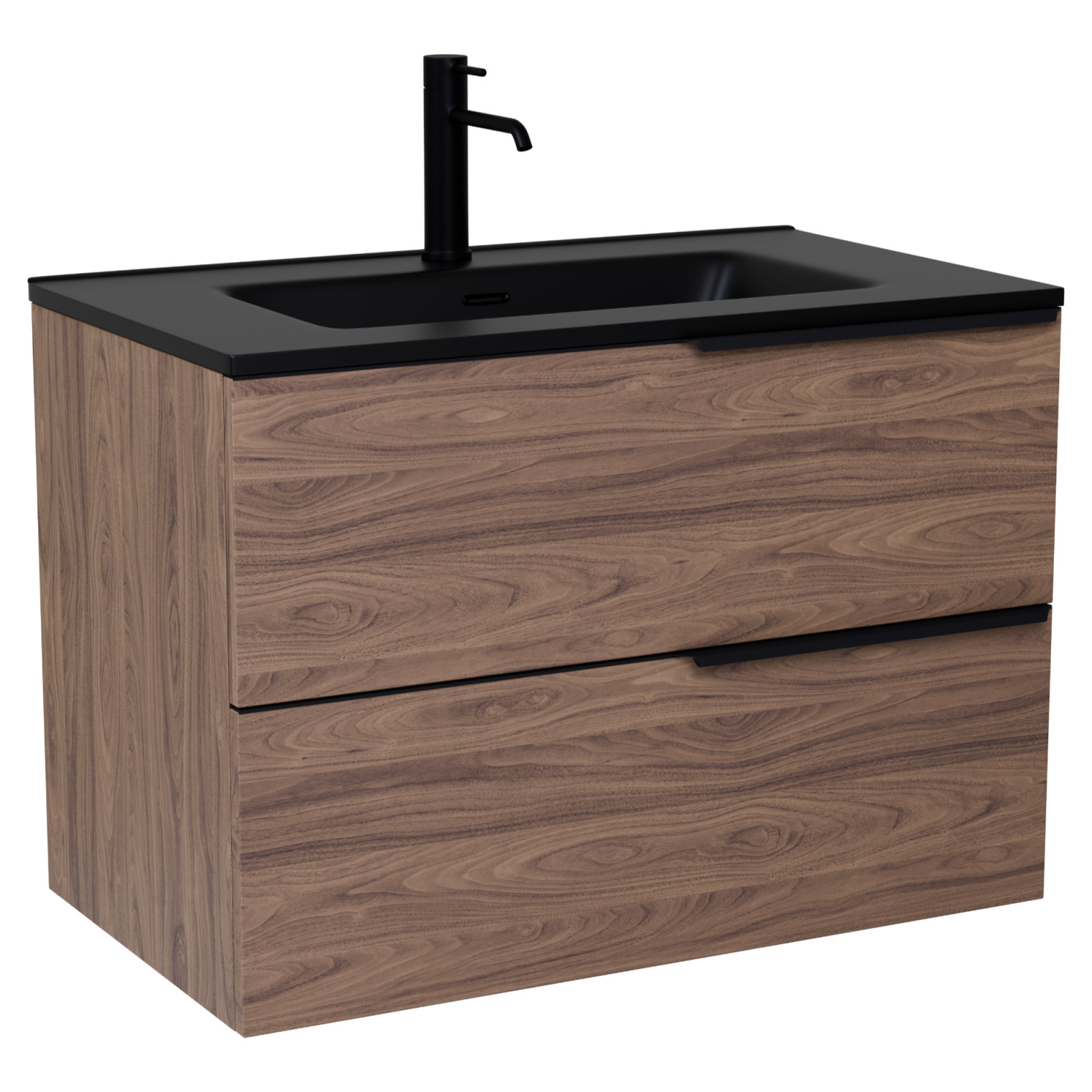 Saját márkás 80 cm széles fali mosdószekrény tölgyfa színben, matt fekete fogantyúkkal, fekete slim mosdóval, rejtett fióksínnel és önbehúzos technológiával ellátott.