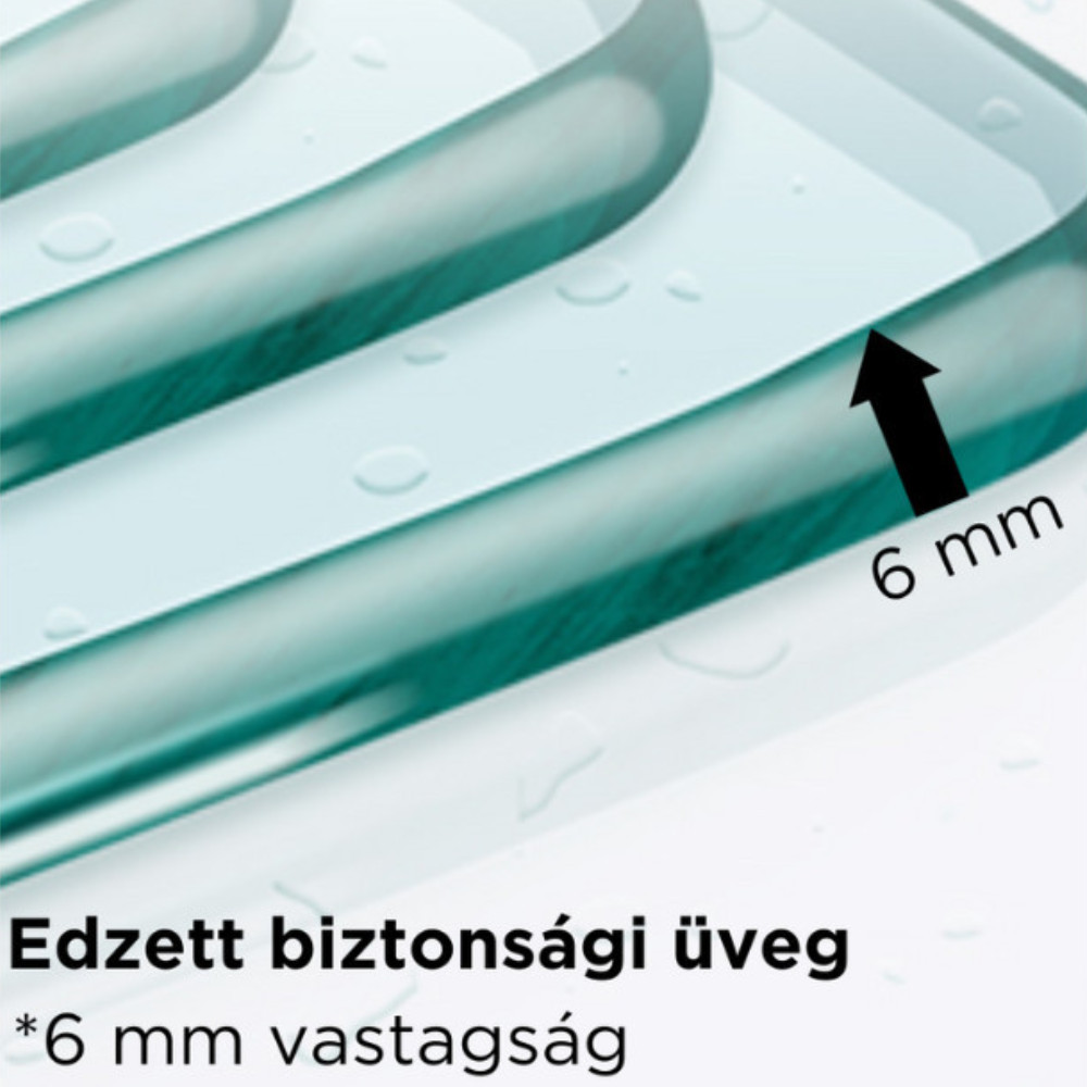 A 6 mm vastag biztonsági edzett üveg olyan speciális hőkezelésen esett át, melynek köszönhetően jobban ellenáll bármilyen külső hatásnak, ezzel minimálisra csökkentve az üvegtörés esélyét.