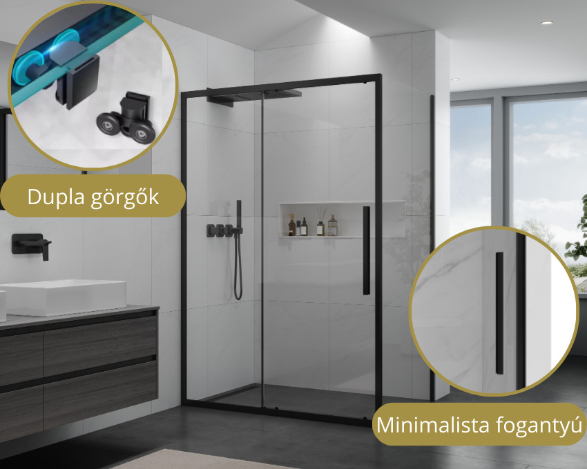 A duplagörgők által biztosított tolóajtós rendszernek köszönhetően a zuhanyajtó könnyedén nyitható, aminek segítségével könnyedén léphetünk be a zuhanytérbe és ki a zuhanyzás végeztével.