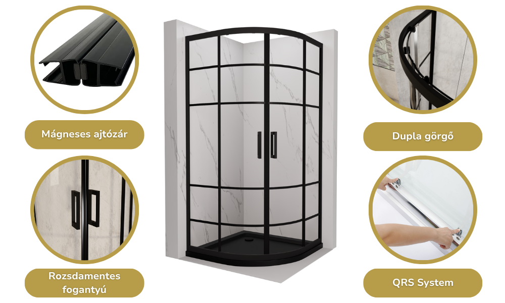 Az általunk legfontosabbnak vélt tulajdonságok íves zuhanykabinunknál: