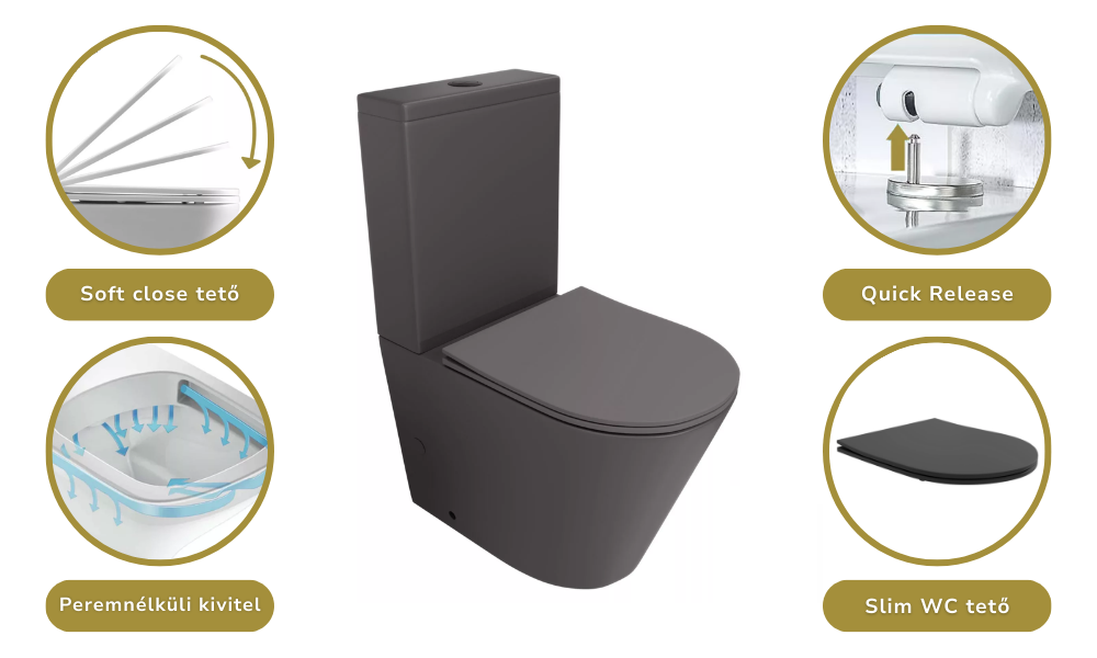 HD Dream Matt Antracit perem nélküli mély öblítésű íves monoblokkos WC hátsó kifolyású slim "P" tetővel és matt fekete nyomógombbal + tartály