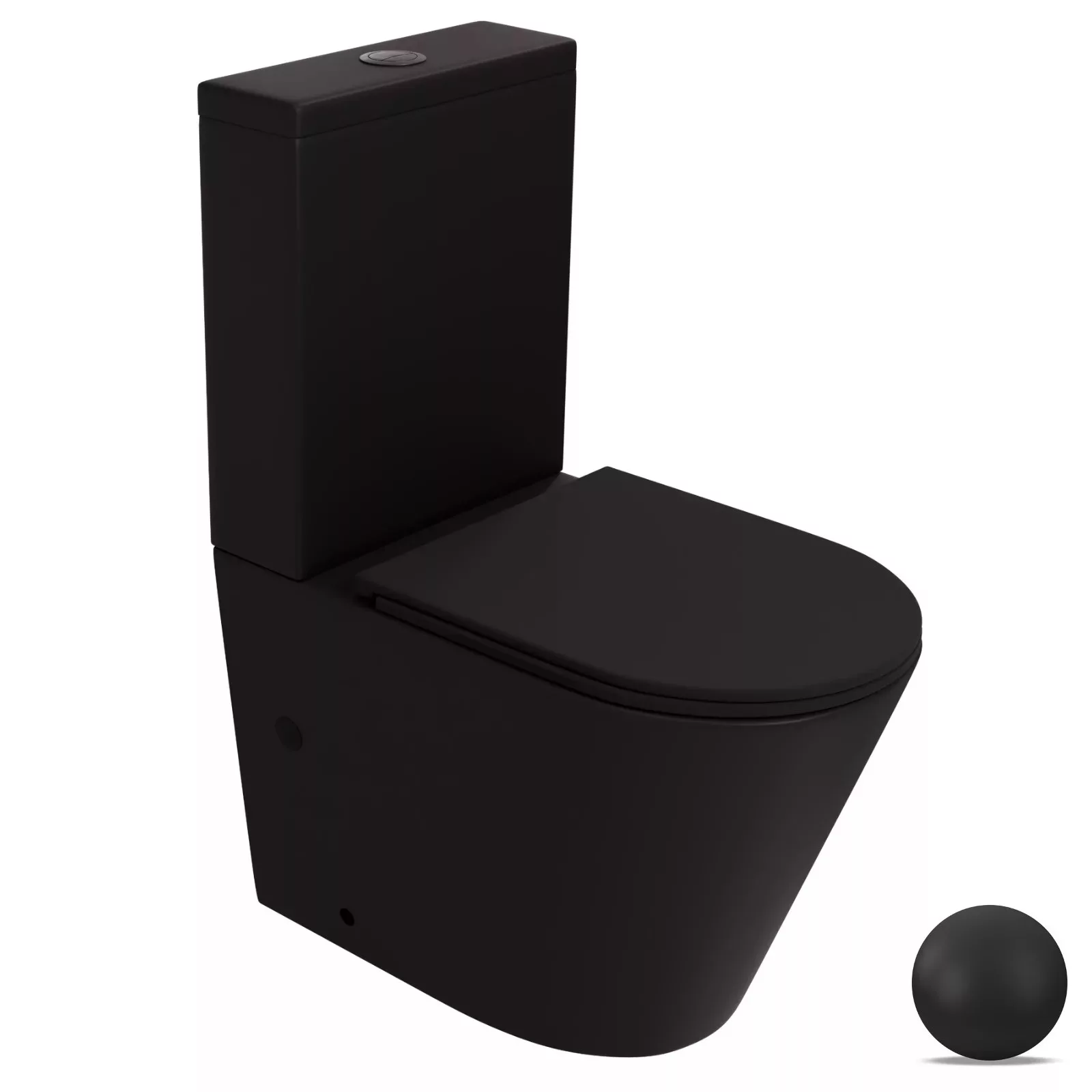 HD Dream Matt Black perem nélküli mély öblítésű íves fekete monoblokkos WC hátsó kifolyású, matt fekete nyomógombbal, tető nélkül + tartály