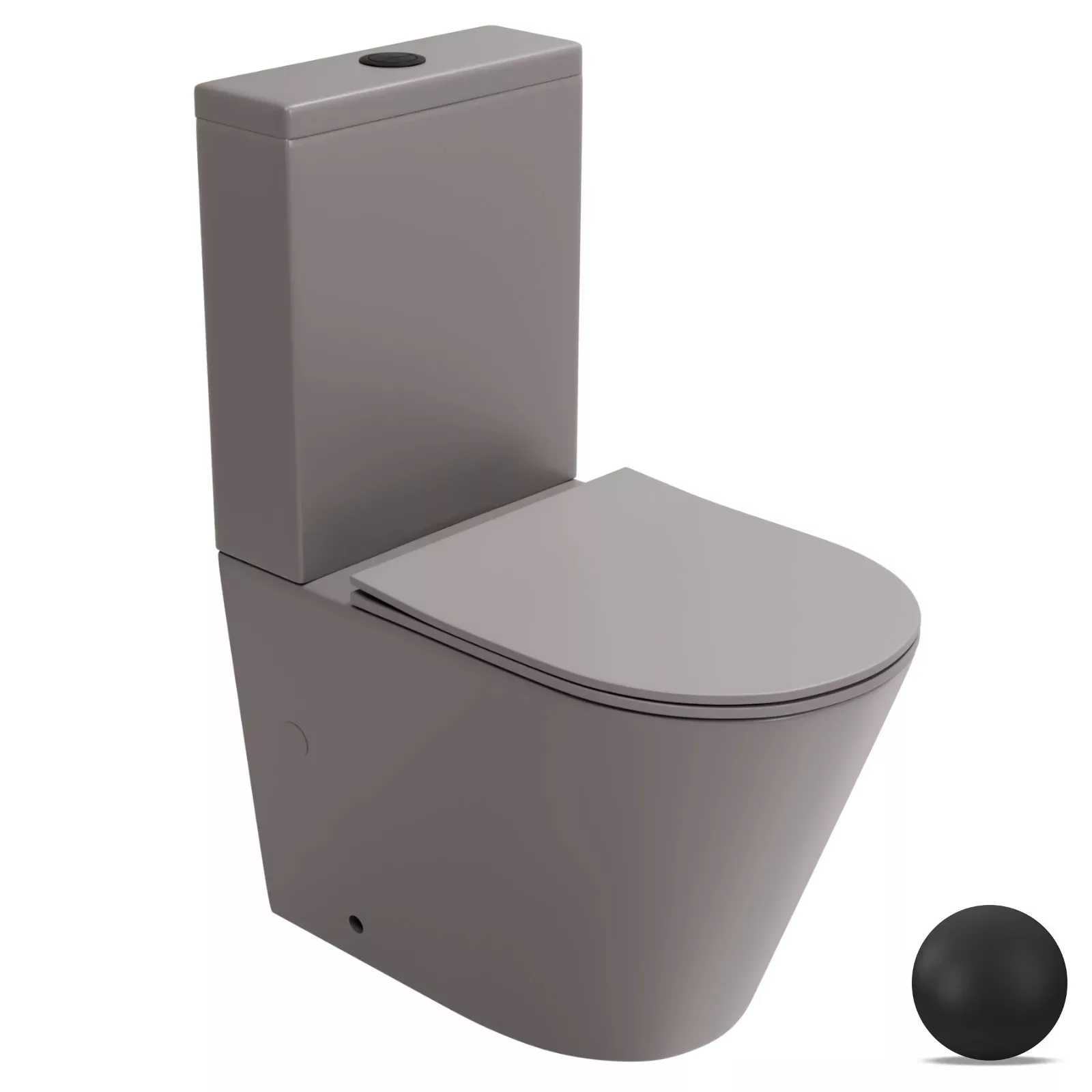 HD Dream Matt Grey perem nélküli mély öblítésű íves monoblokkos WC alsó kifolyású, matt fekete nyomógombbal, tető nélkül + tartály