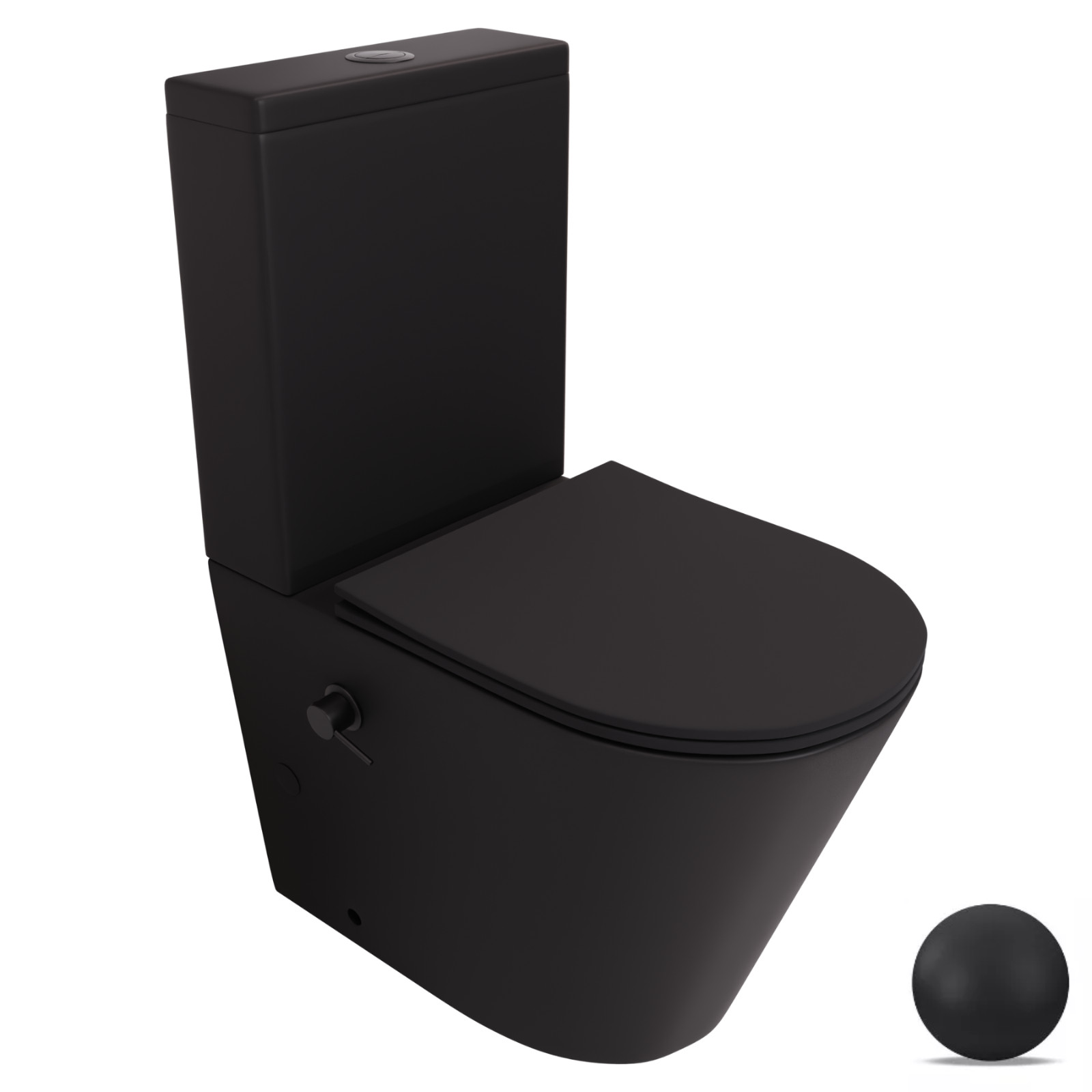 HD Echo Matt Black perem nélküli mély öblítésű íves monoblokkos WC alsó kifolyású, bidé funkcióval, slim "P" tetővel és matt fekete kiegészítőkkel + tartály