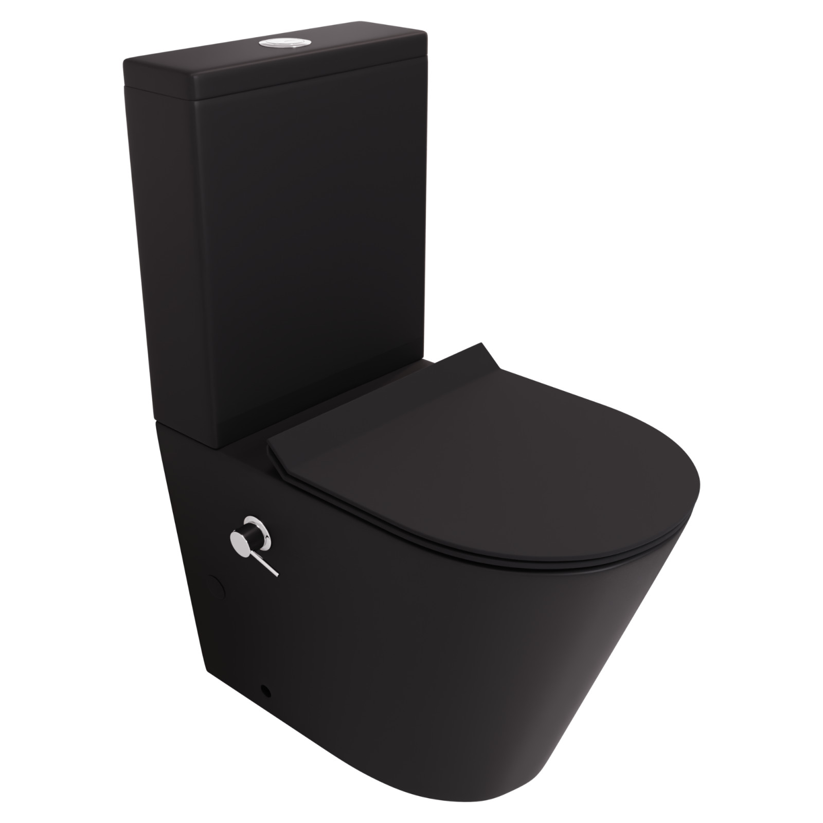 HD Echo Matt Black perem nélküli mély öblítésű íves monoblokkos WC hátsó kifolyású, bidé funkcióval, slim "F" tetővel és krómozott kiegészítőkkel + tartály