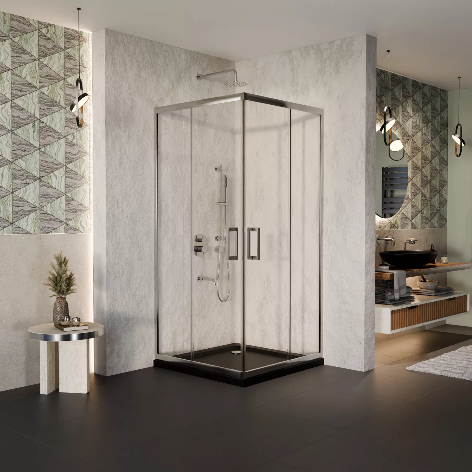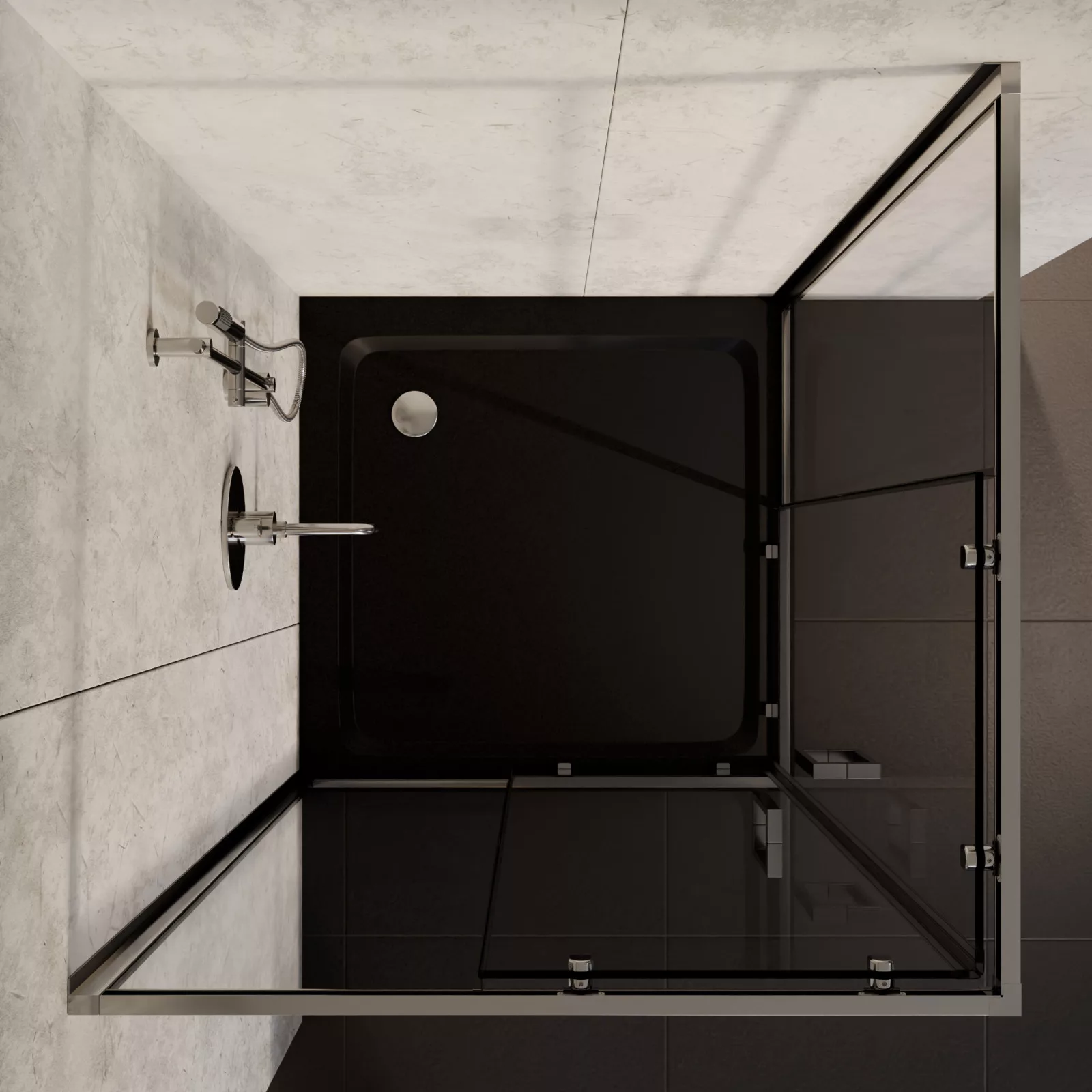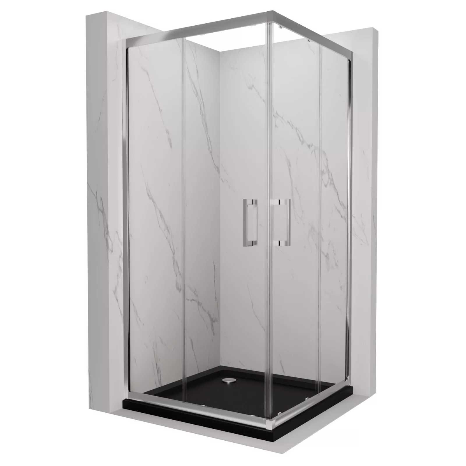 HD Elio 80x80 szögletes két tolóajtós zuhanykabin fekete slim zuhanytálcával és króm szifonnal