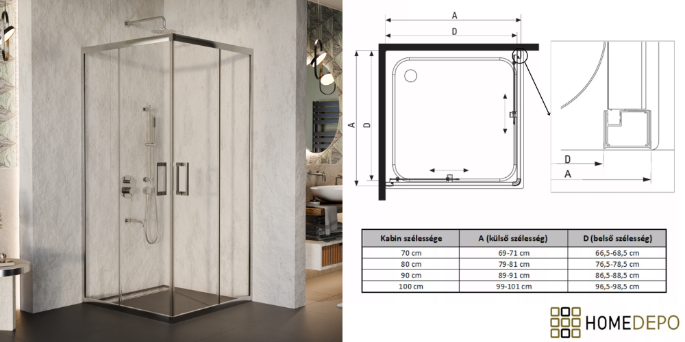 Napjainkban a praktikum mellett a fürdőszoba esztétikus megjelenése is fontos szempont. Az átlátszó üveges zuhanykabinok egyik előnye, hogy nem szűkitik össze a teret, elegáns, légies megjelenést kölcsönöznek a fürdőszobának. Az átlátszó üvegű zuhanykabinok a hagyományos és modern fürdőszobákban is megállják a helyüket. Az tolóajtónál az ajtónyílásból elvesznek az egymásra csúszó részek. Kisebb helyiségekben is kiváló megoldás lehet helytakarékosság szempontjából, mivel így nem kell arra figyeljen, hogy legyen elég hely az ajtó kinyitásához. A szögletes formával a rendelkezésre álló teret maximálisan ki lehet használni. Előnye, hogy zuhanyzáskor kényelmes, az íves formánál jelentősen nagyobb tér áll rendelkezésre. Saját márkás, Homedepo Elio, szögletes zuhanykabinunk, dupla görgőkkel érhető el, aminek köszönhetően jobban eloszlik a terhelés, egy ajtó 2 pont helyett 4 ponton gördül. Ez nagy mértékben biztosítja az egyenletesebb, simább működést és a hosszabb élettartamot. A görgők további fontos tulajdonságai közé sorolható, hogy Quick release systemmel ellátottak, aminek segítségével könnyedén fel- és leszerelhető a könnyedebb tisztítás érdekében.
