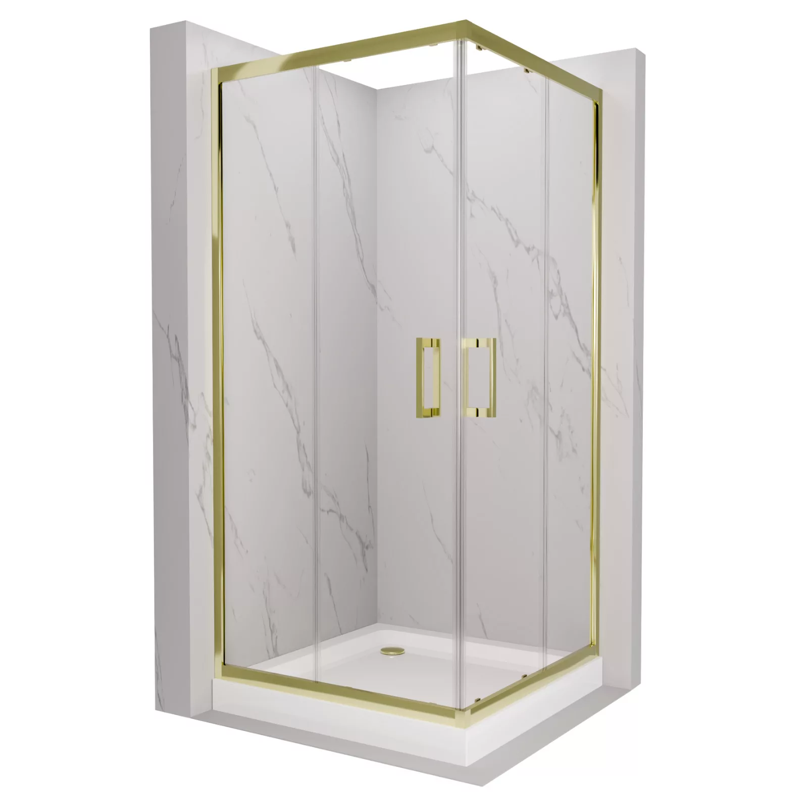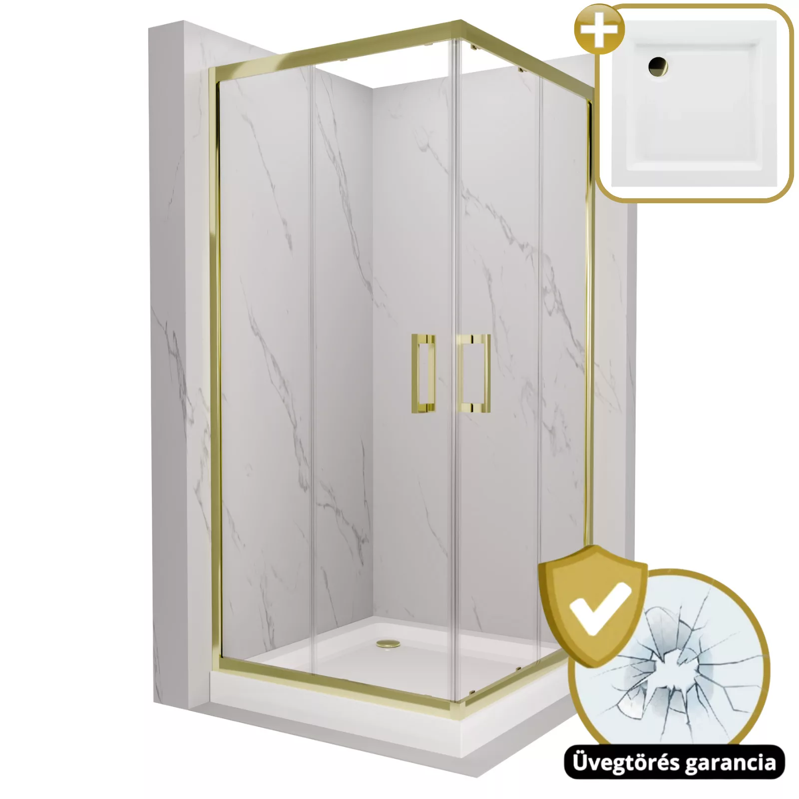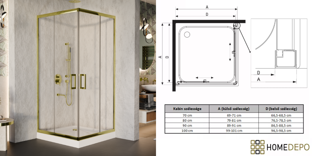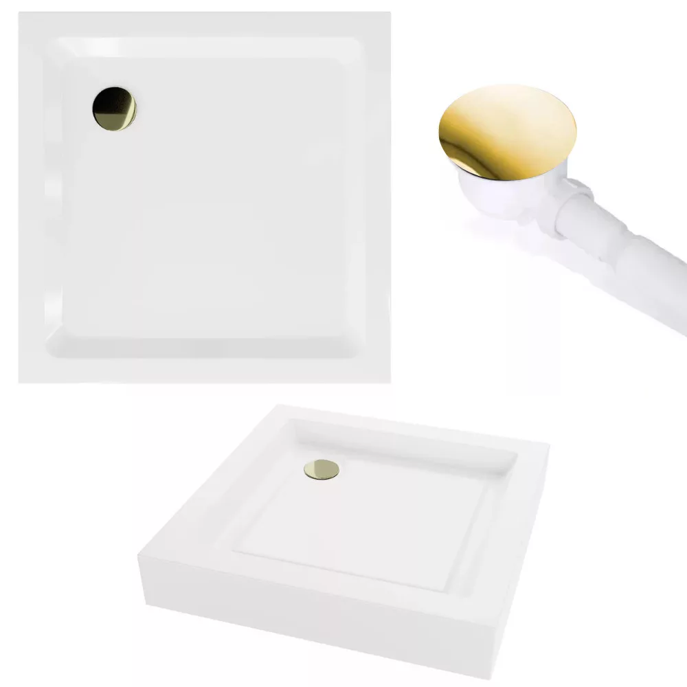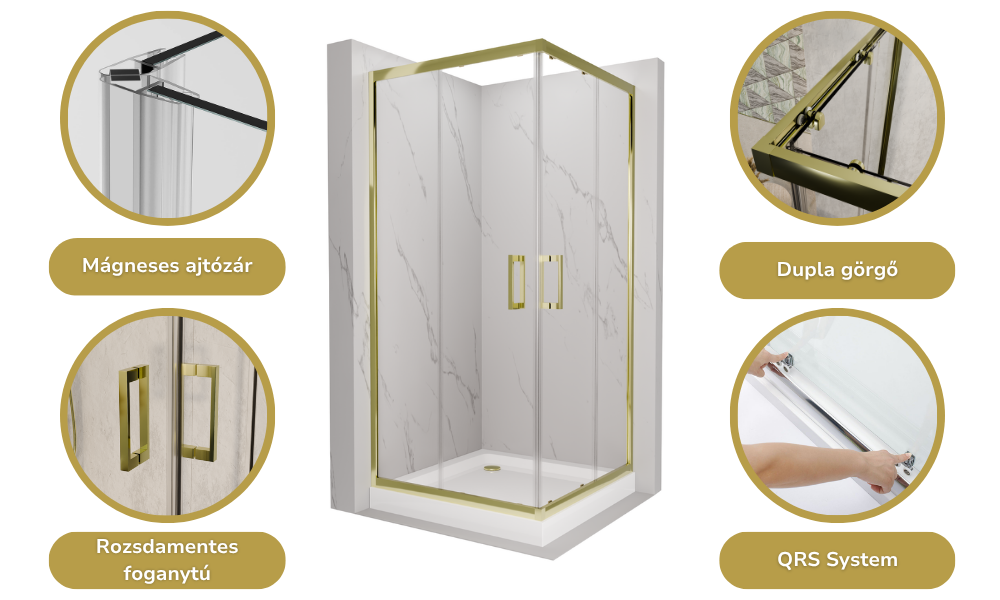 HD Elio Gold 70x70 szögletes két tolóajtós zuhanykabin fehér magas zuhanytálcával és arany szifonnal