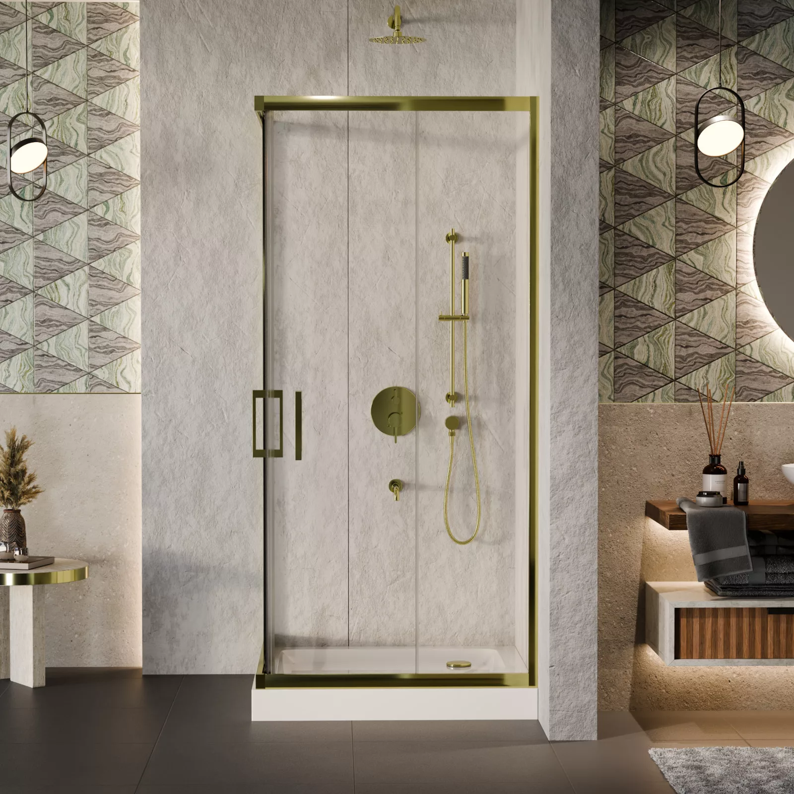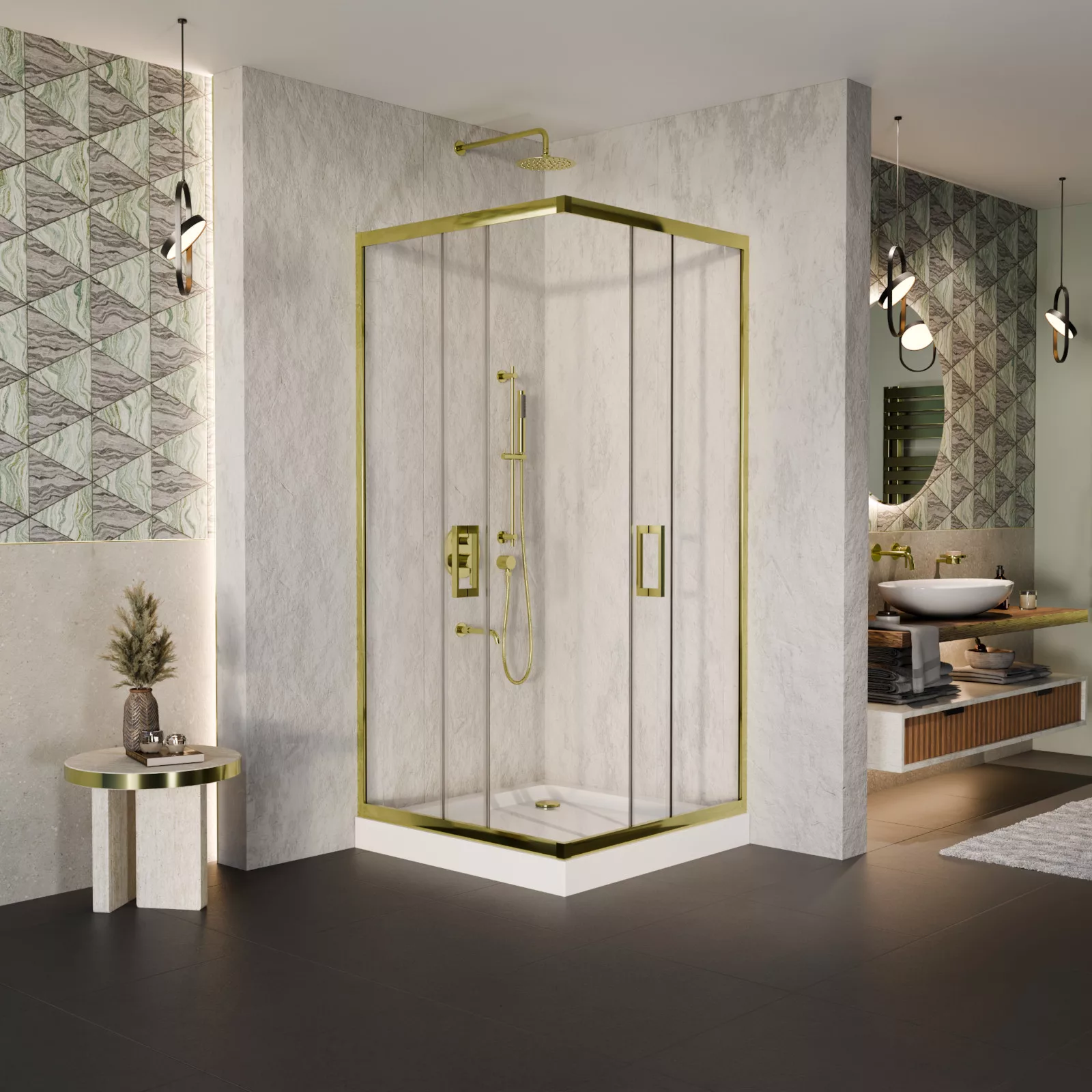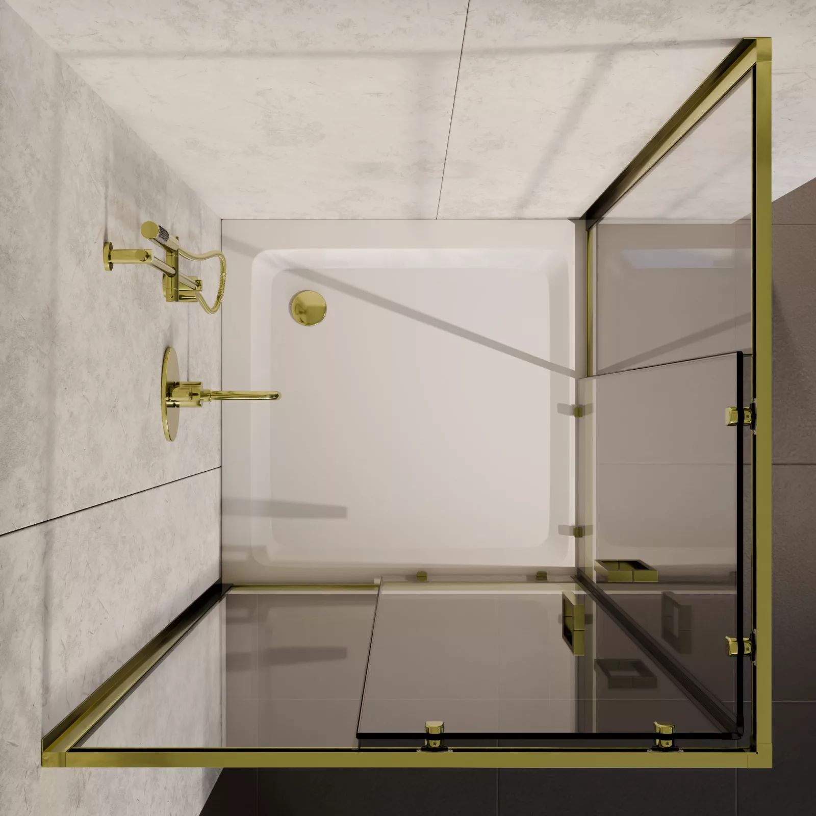 HD Elio Gold 70x70 szögletes két tolóajtós zuhanykabin fehér magas zuhanytálcával és arany szifonnal