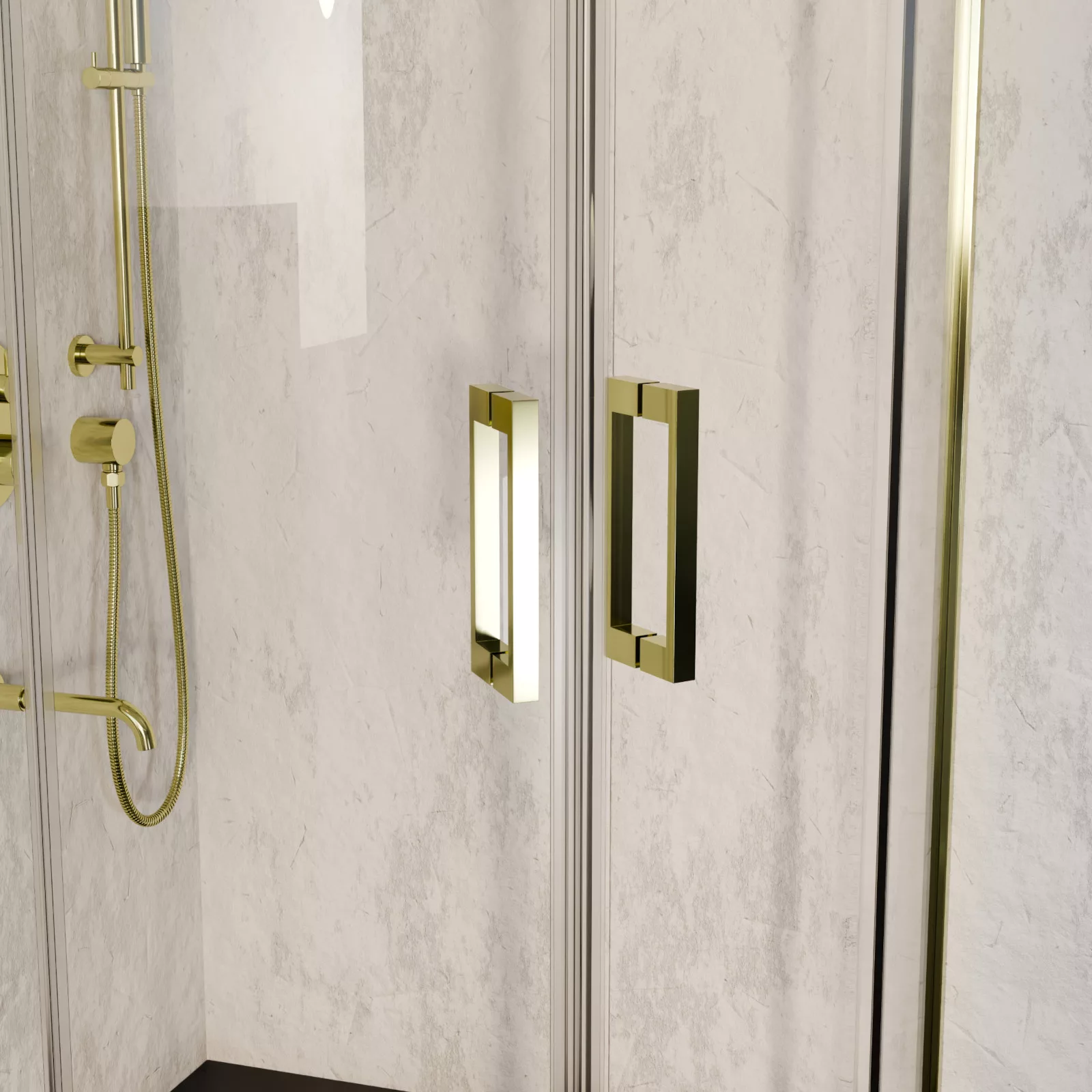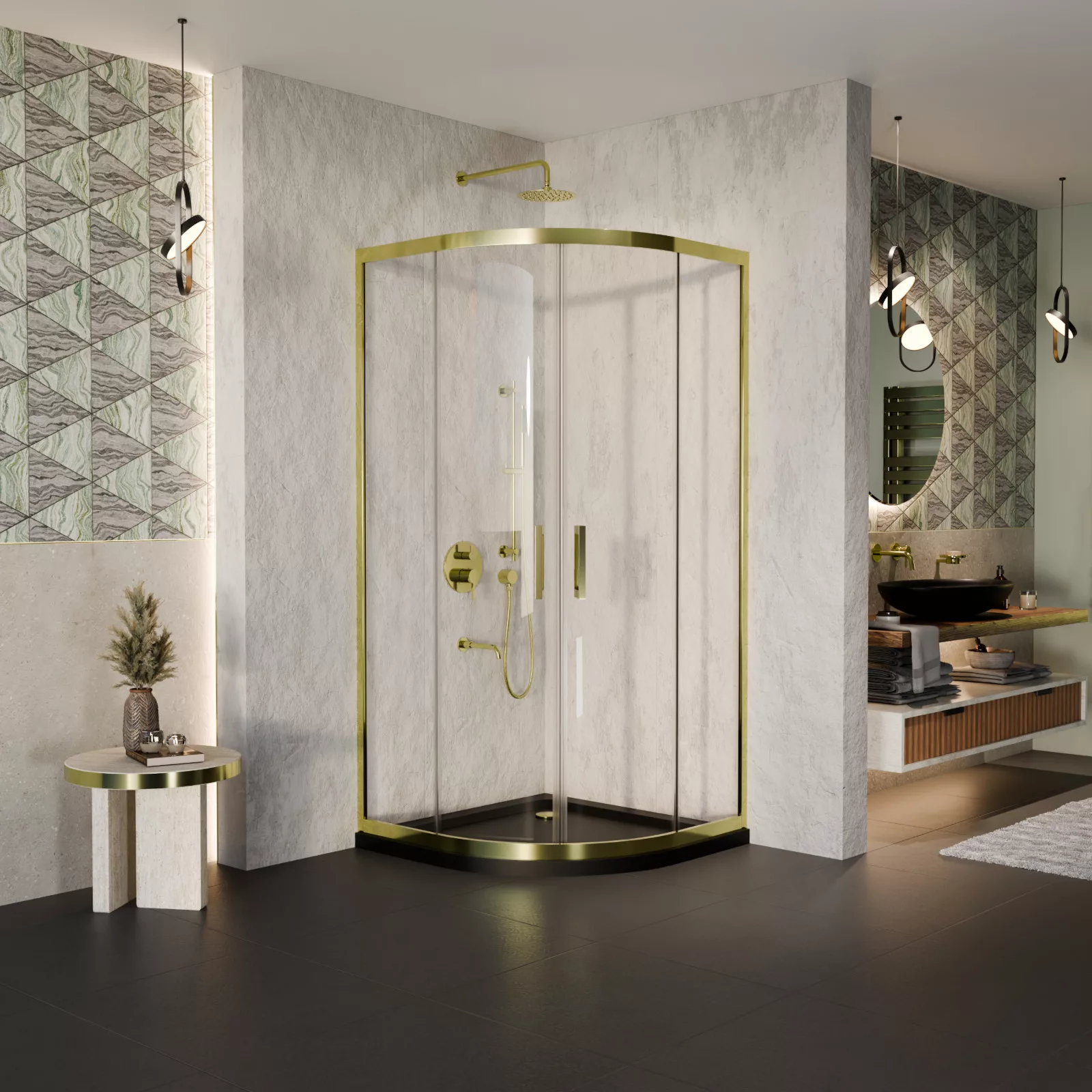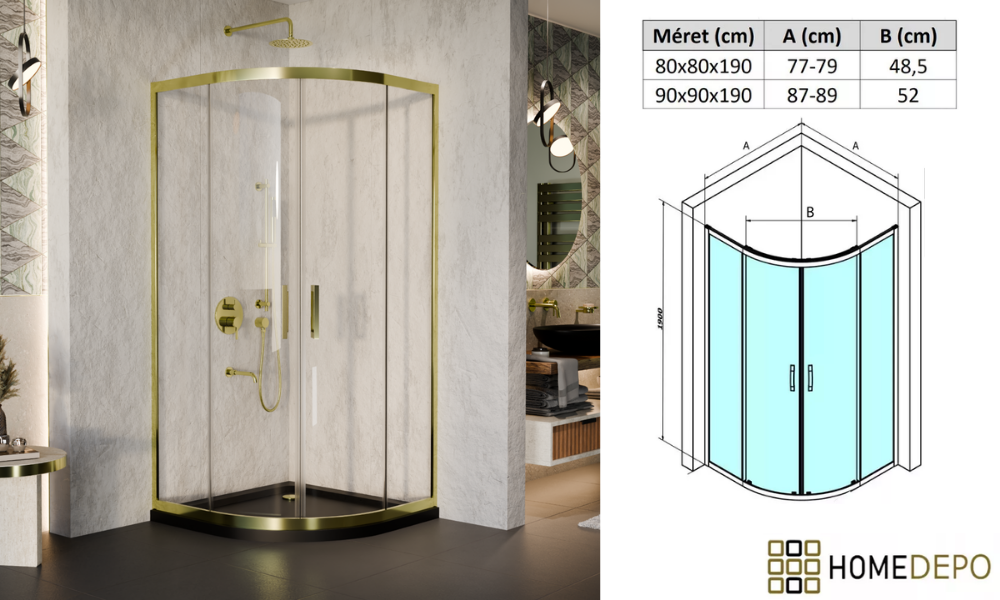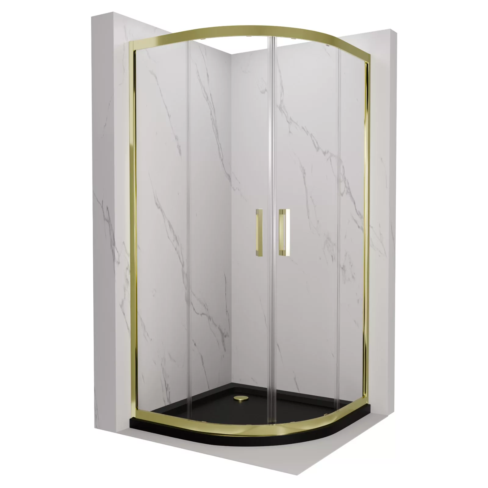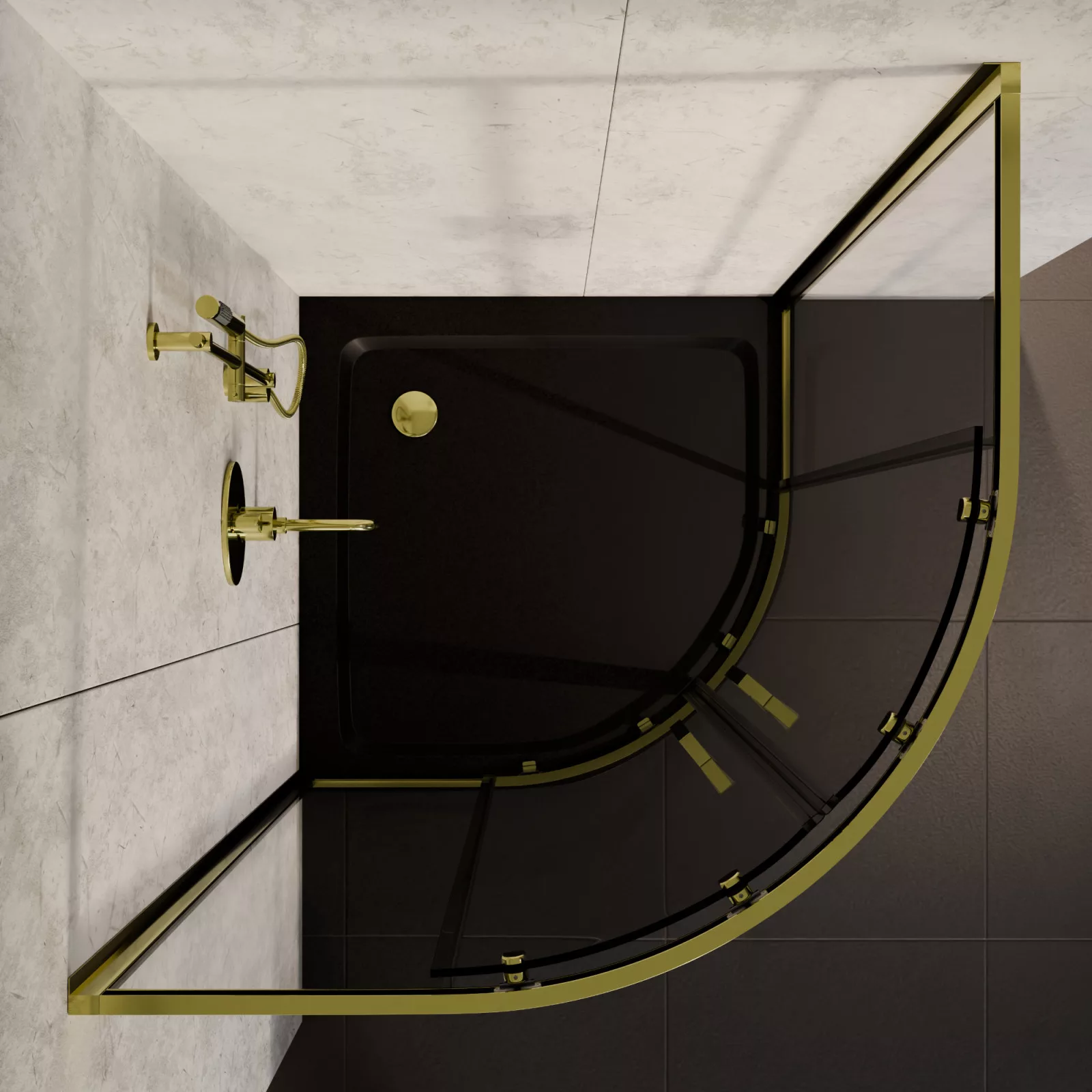 HD Elio Gold 80x80 íves két tolóajtós zuhanykabin fekete slim zuhanytálcával és arany szifonnal