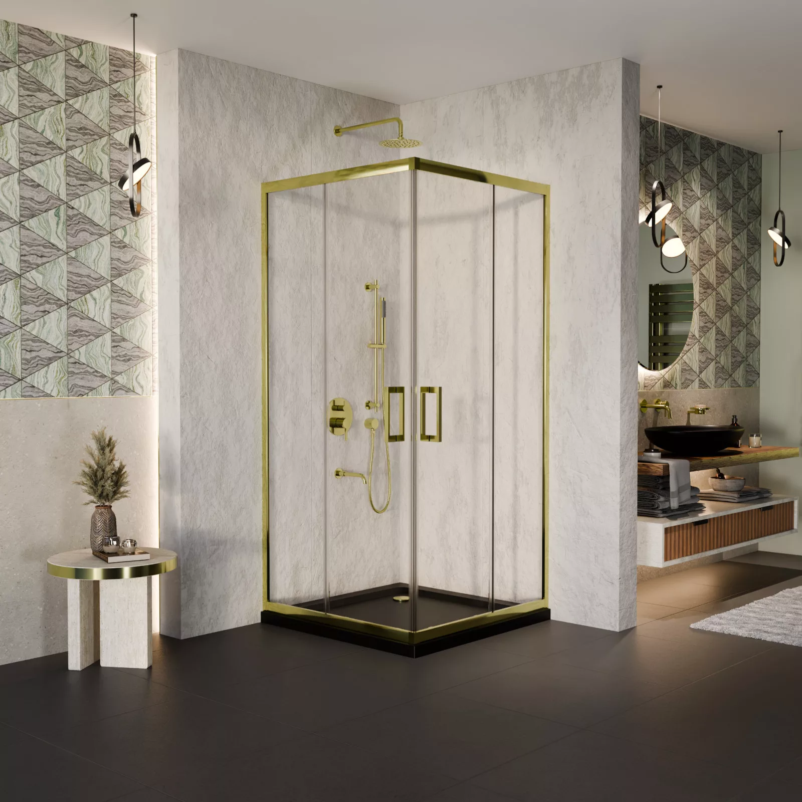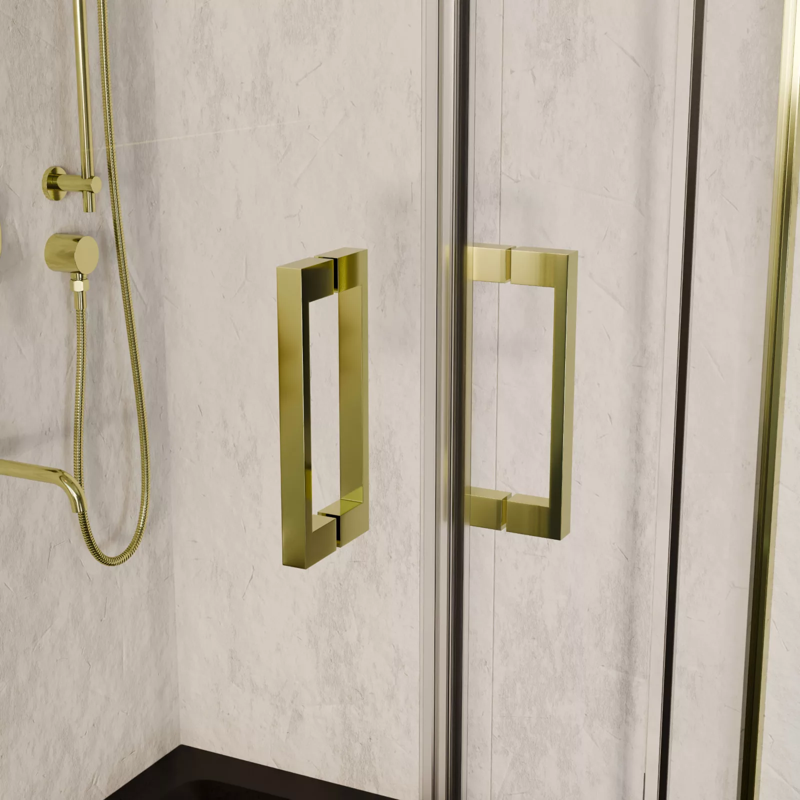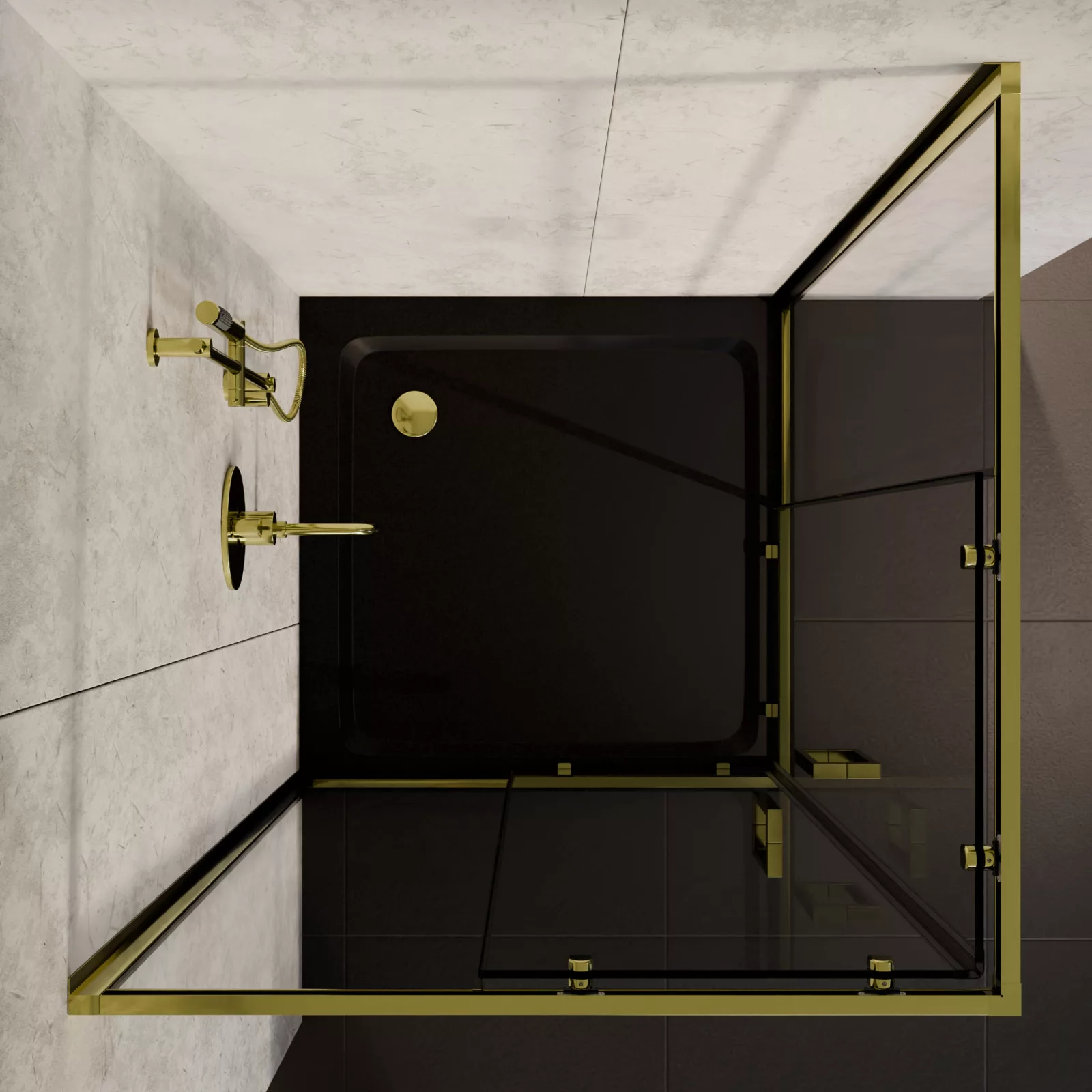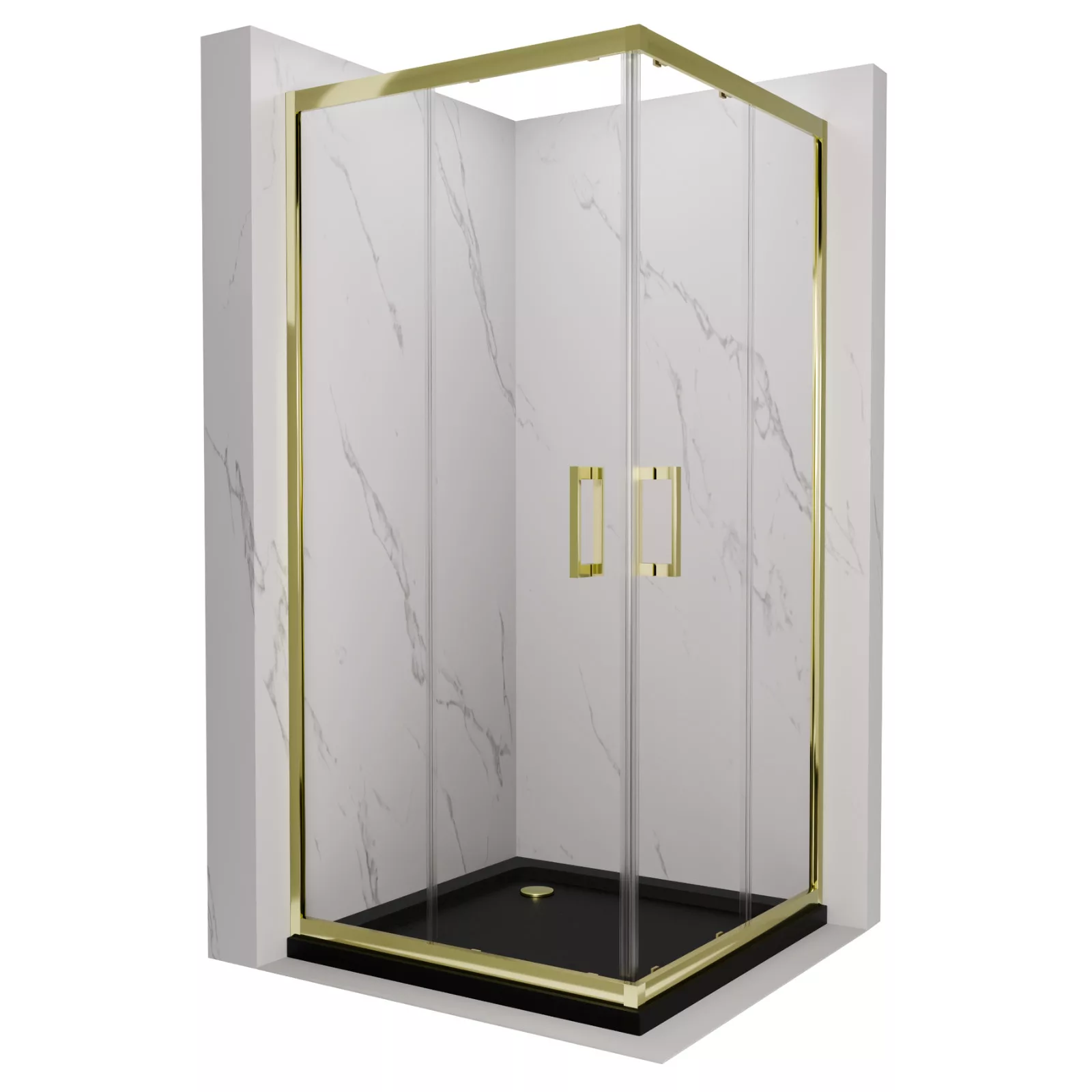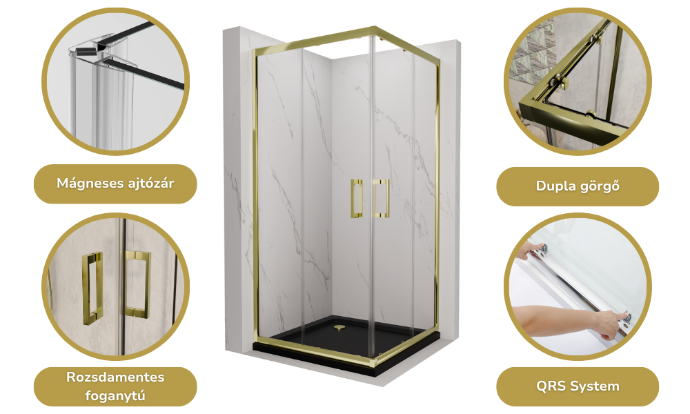 HD Elio Gold 80x80 szögletes két tolóajtós zuhanykabin fekete slim zuhanytálcával és arany szifonnal