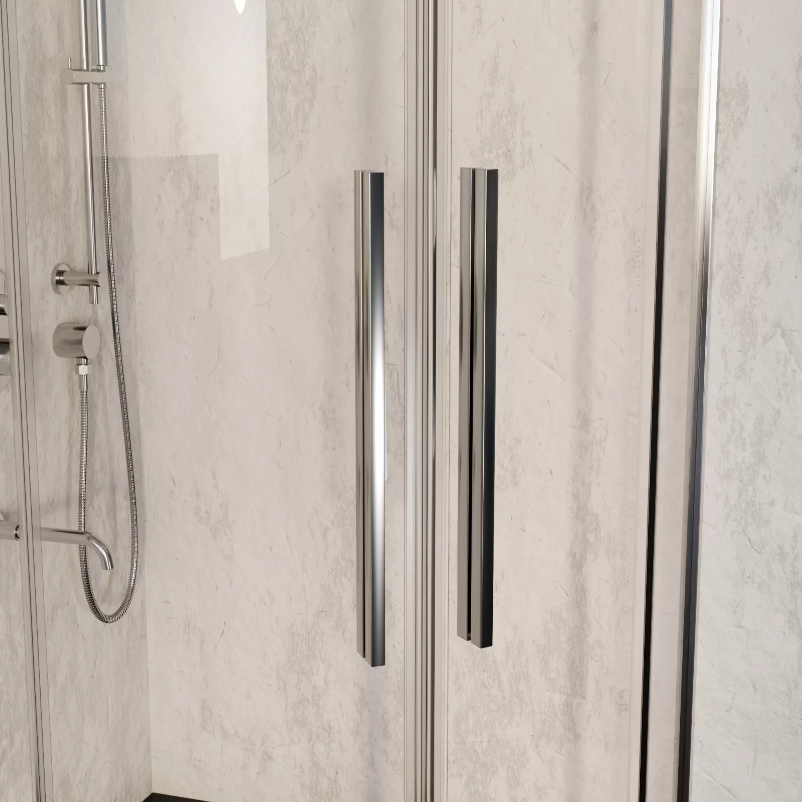 - Felszereltség: Krómozott állítható alumínium profilok, polírozott minimalista fogantyú, vízzáró szilikon profilok, mágneses ajtózár