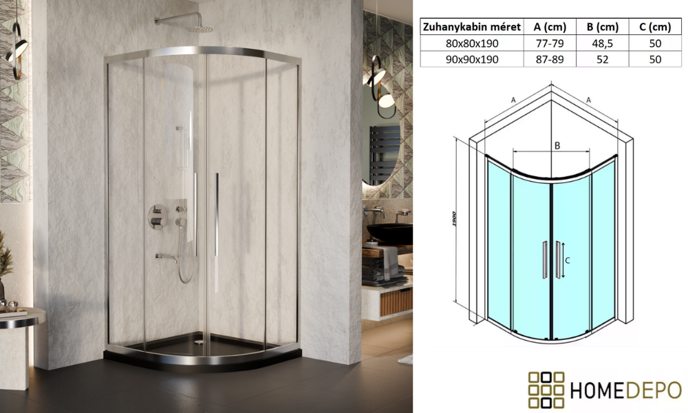 Napjainkban a praktikum mellett a fürdőszoba esztétikus megjelenése is fontos szempont. Az átlátszó üveges zuhanykabinok egyik előnye, hogy nem szűkitik össze a teret, elegáns, légies megjelenést kölcsönöznek a fürdőszobának. Az átlátszó üvegű zuhanykabinok a hagyományos és modern fürdőszobákban is megállják a helyüket. Az tolóajtónál az ajtónyílásból elvesznek az egymásra csúszó részek. Kisebb helyiségekben is kiváló megoldás lehet helytakarékosság szempontjából, mivel így nem kell arra figyeljen, hogy legyen elég hely az ajtó kinyitásához. A lekerekített ívű zuhanykabin az egyik legelterjedtebb forma hazánkban. Általában akkor alkalmazzák, ha kedvezőbb térkihasználást szeretnének a fürdőszobában, mert a lekerekített ív miatt több és kényelmesebb közlekedő felület maradhat. Saját márkás, Homedepo Elio, íves zuhanykabinunk, dupla görgőkkel érhető el, aminek köszönhetően jobban eloszlik a terhelés, egy ajtó 2 pont helyett 4 ponton gördül. Ez nagy mértékben biztosítja az egyenletesebb, simább működést és a hosszabb élettartamot. A görgők további fontos tulajdonságai közé sorolható, hogy Quick release systemmel ellátottak, aminek segítségével könnyedén fel- és leszerelhető a könnyedebb tisztítás érdekében.
