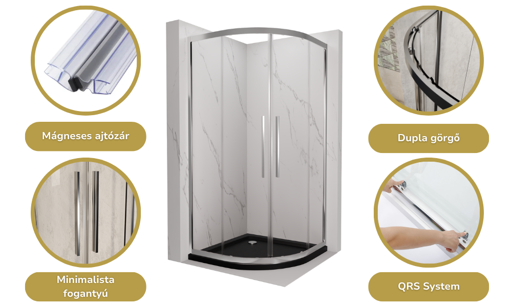 Az általunk legfontosabbnak vélt tulajdonságok íves zuhanykabinunknál: