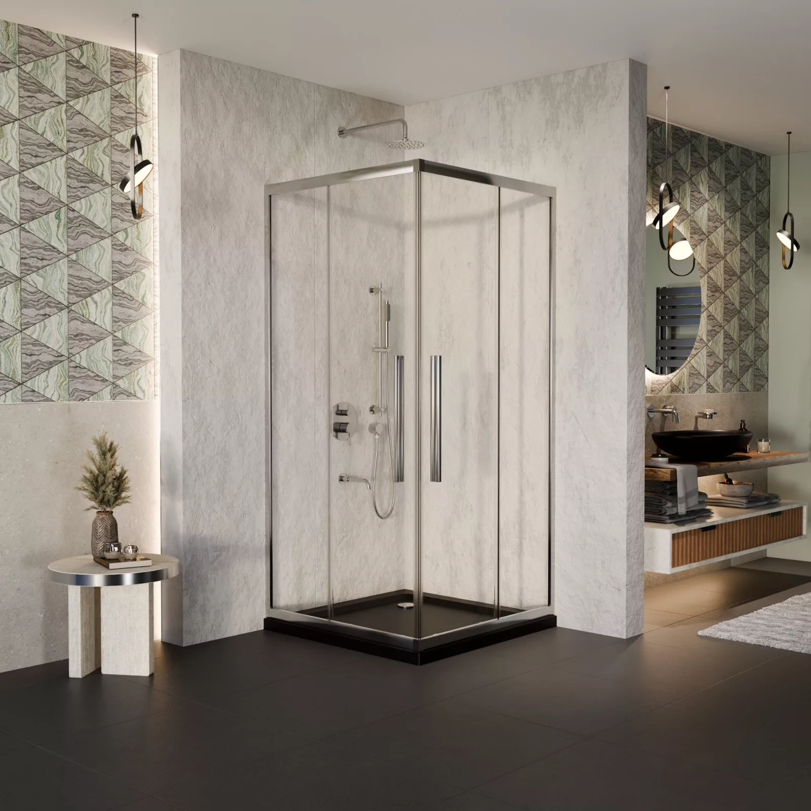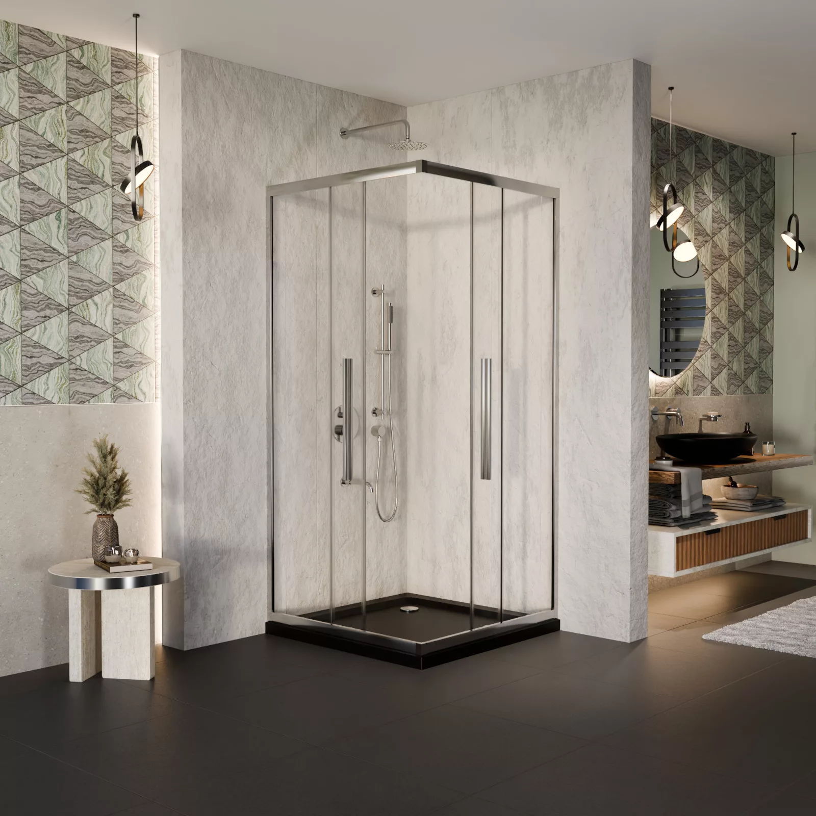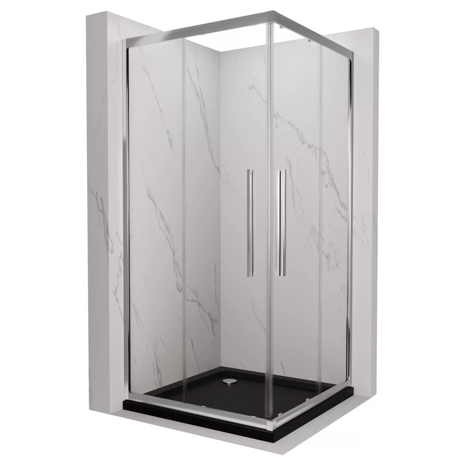 HD Elio+ 80x80 szögletes két tolóajtós zuhanykabin fekete slim zuhanytálcával és króm szifonnal